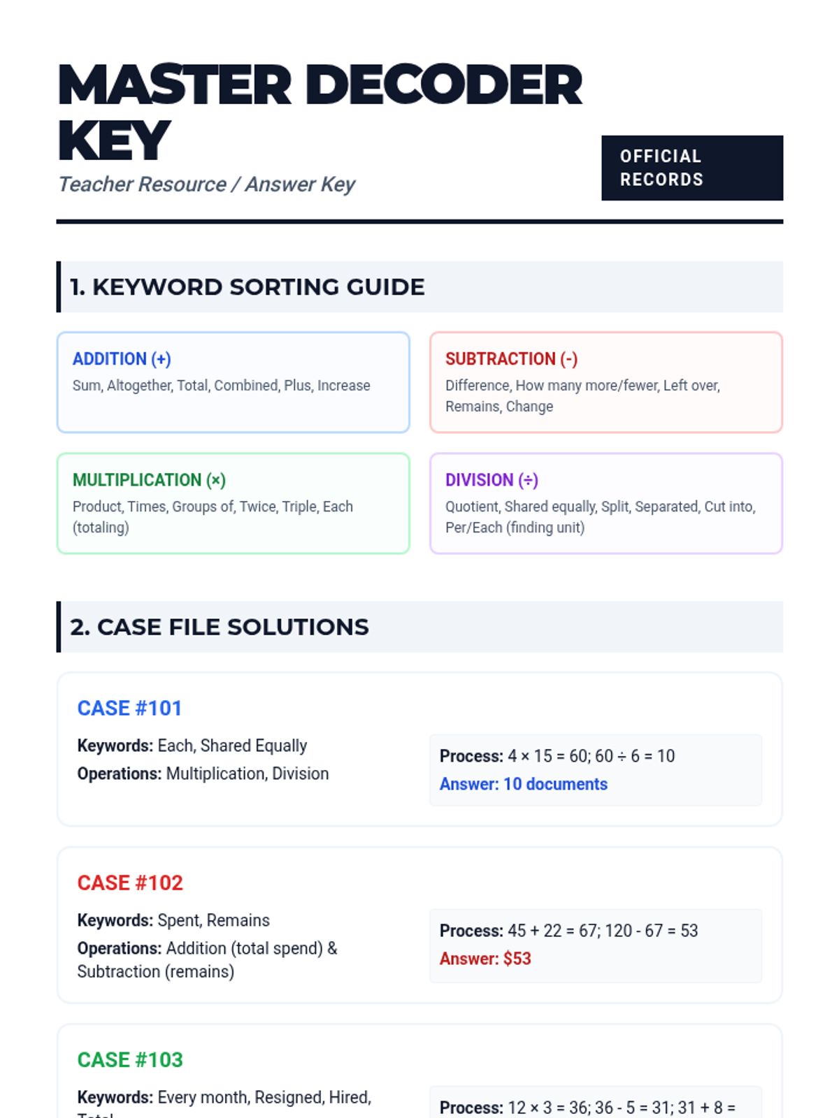 A teacher's answer key for the Operation Decoders lesson, including the keyword sorting guide, full solutions to the worksheet cases, and instructional tips for common student misconceptions.