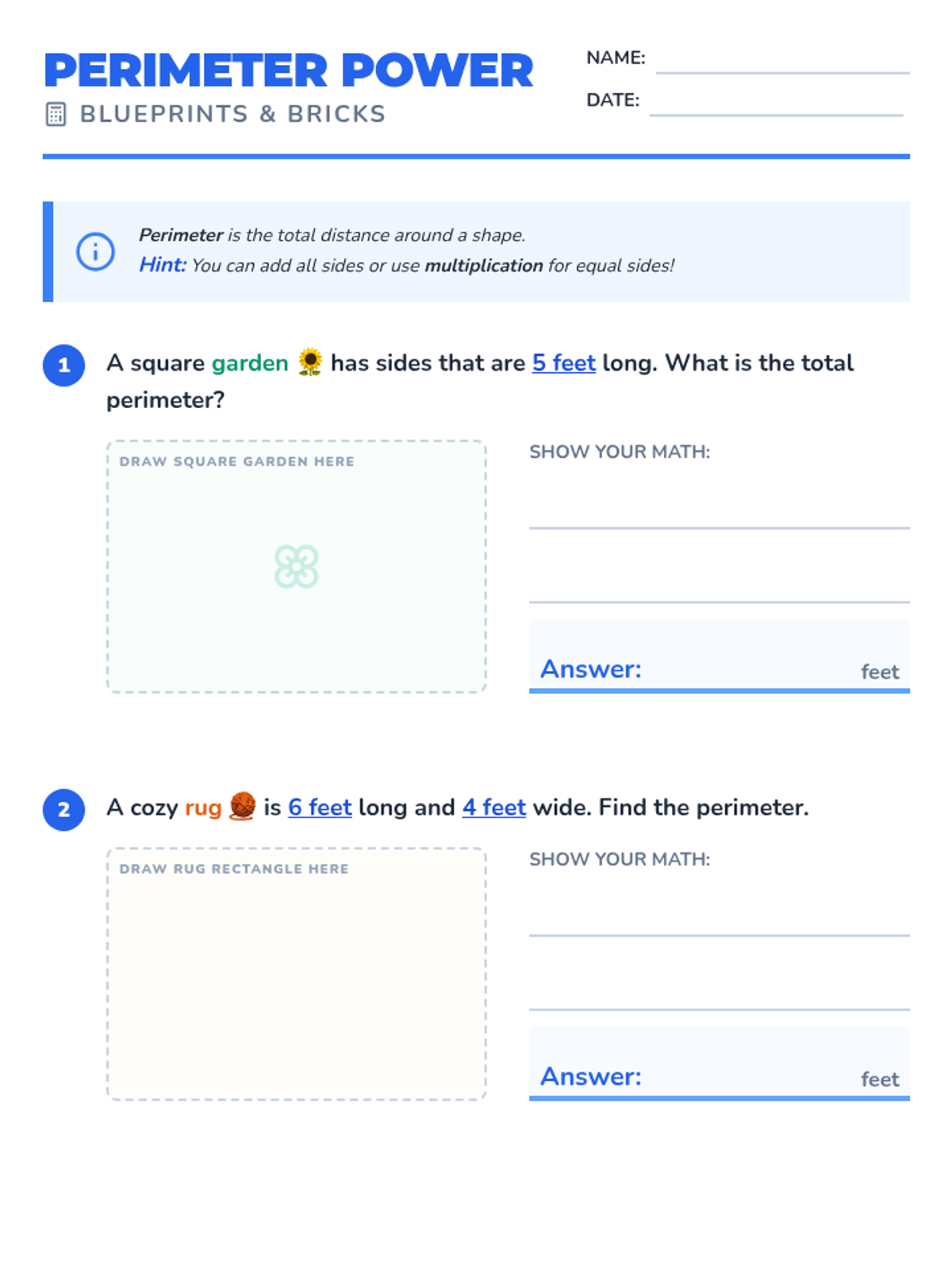 A 10-problem worksheet for 3rd-grade students focused on perimeter. It includes visual cues, word problems with drawing space, tables, and graphs. Updated with high-contrast math sentences, corrected hexagon facts, and improved layout for readability. Final version with balanced spacing.