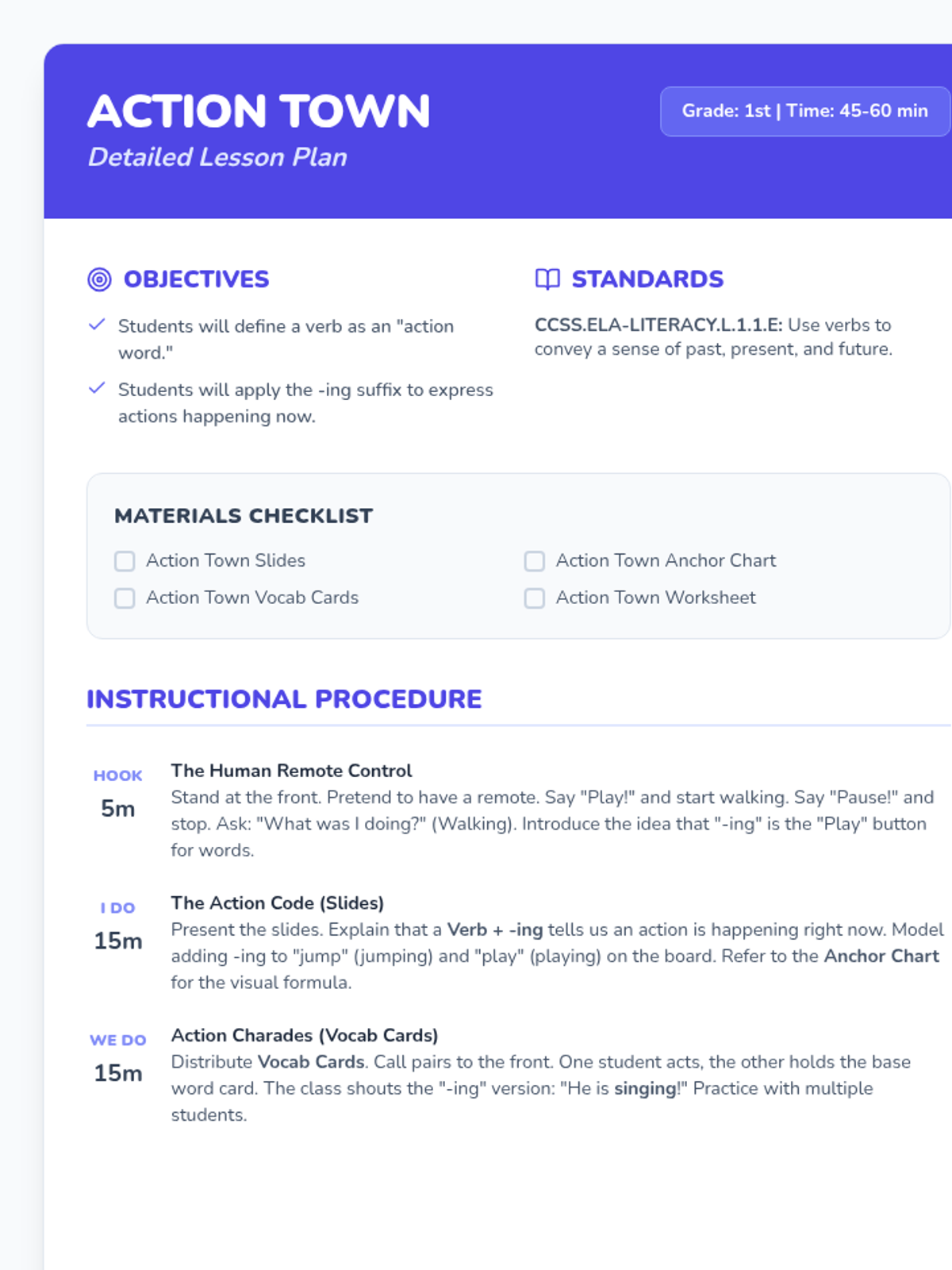 A comprehensive two-page lesson plan for 'Action Town' designed for 1st grade teachers. It includes clear learning objectives, CCSS standards, a step-by-step instructional sequence (Hook, I Do, We Do, You Do), assessment strategies, and differentiation tips.