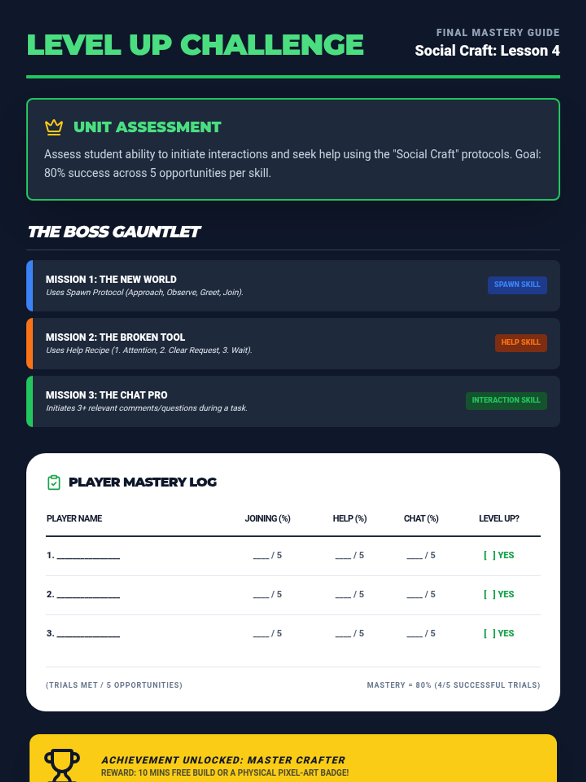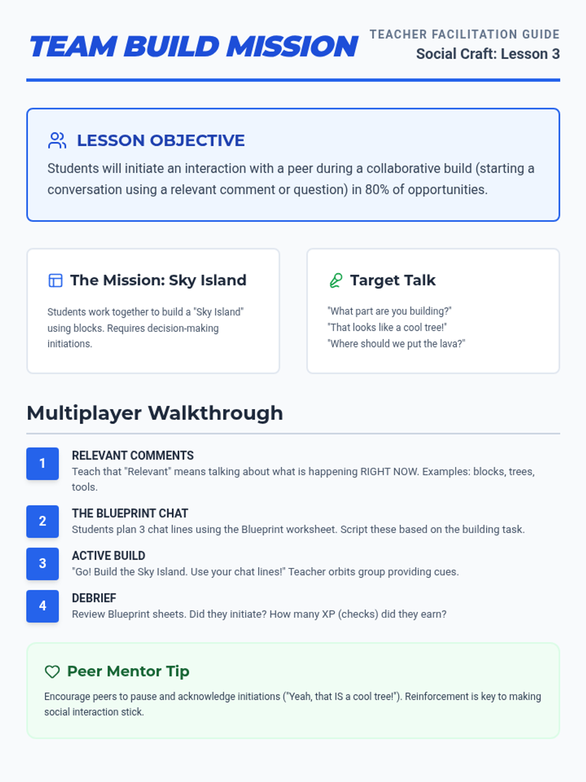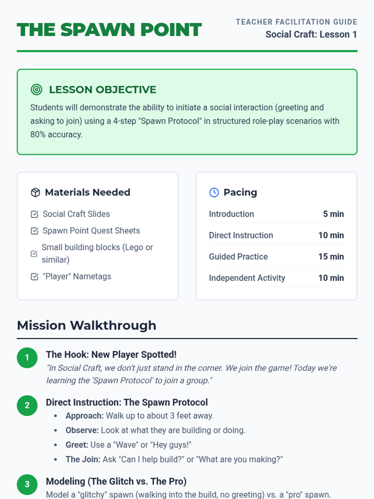 A teacher facilitation guide for the first lesson of the Social Craft series, providing clear instructions for teaching initiation skills through a Minecraft-inspired 'Spawn Protocol'.