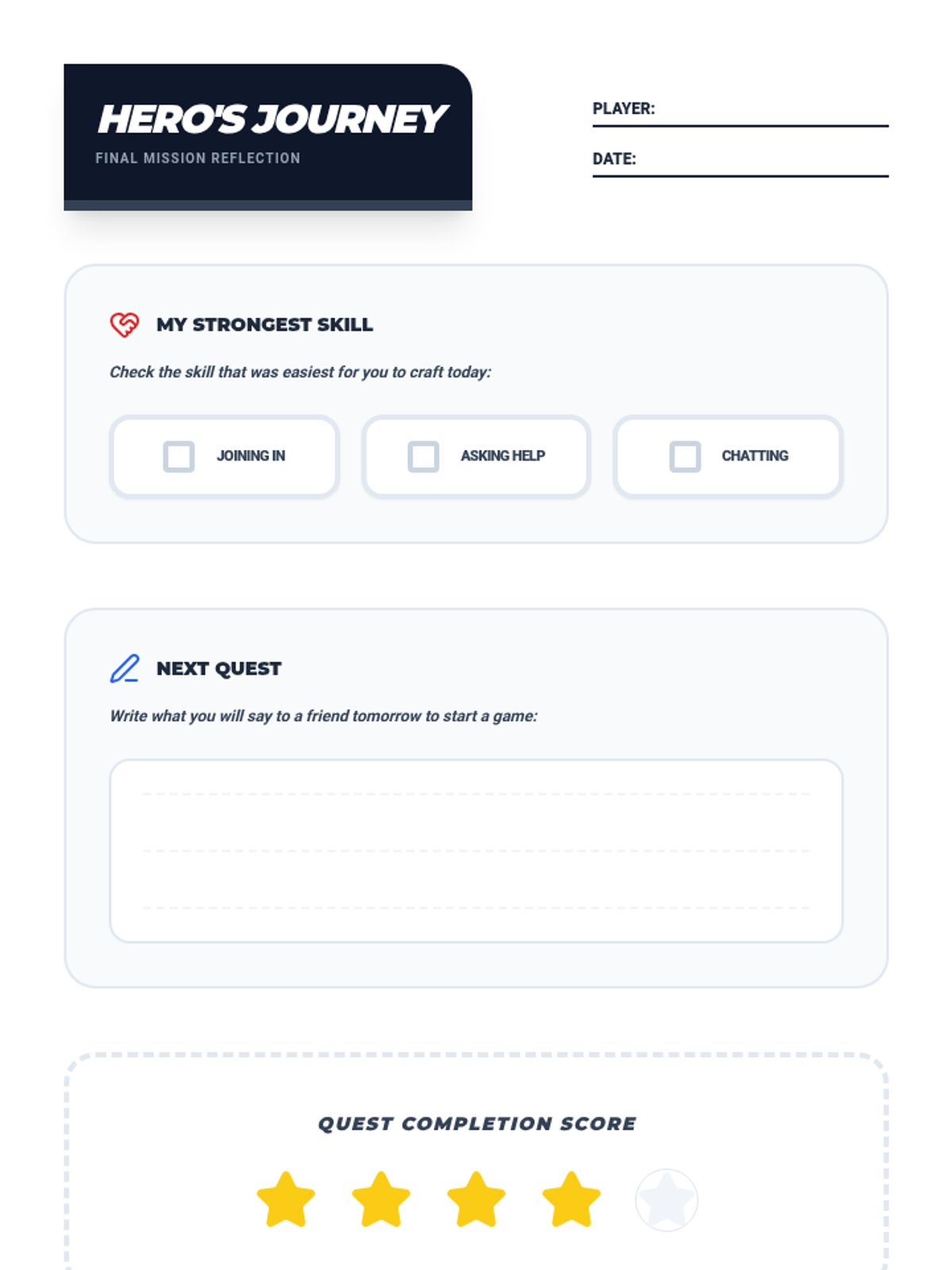 A final reflection document for students to self-assess their growth in social skills and plan for future social initiations.