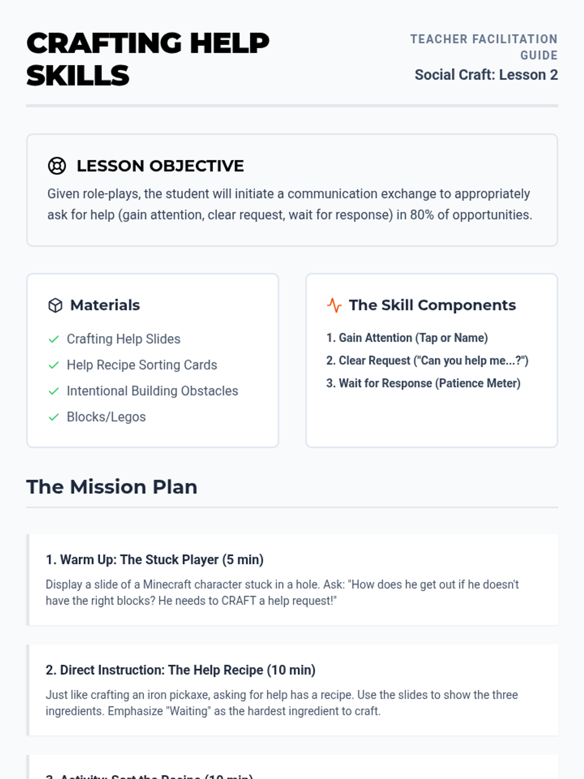 A teacher guide for the second lesson, focusing on the steps of asking for help using a 'crafting recipe' analogy to make the social skill concrete for 4th grade students.