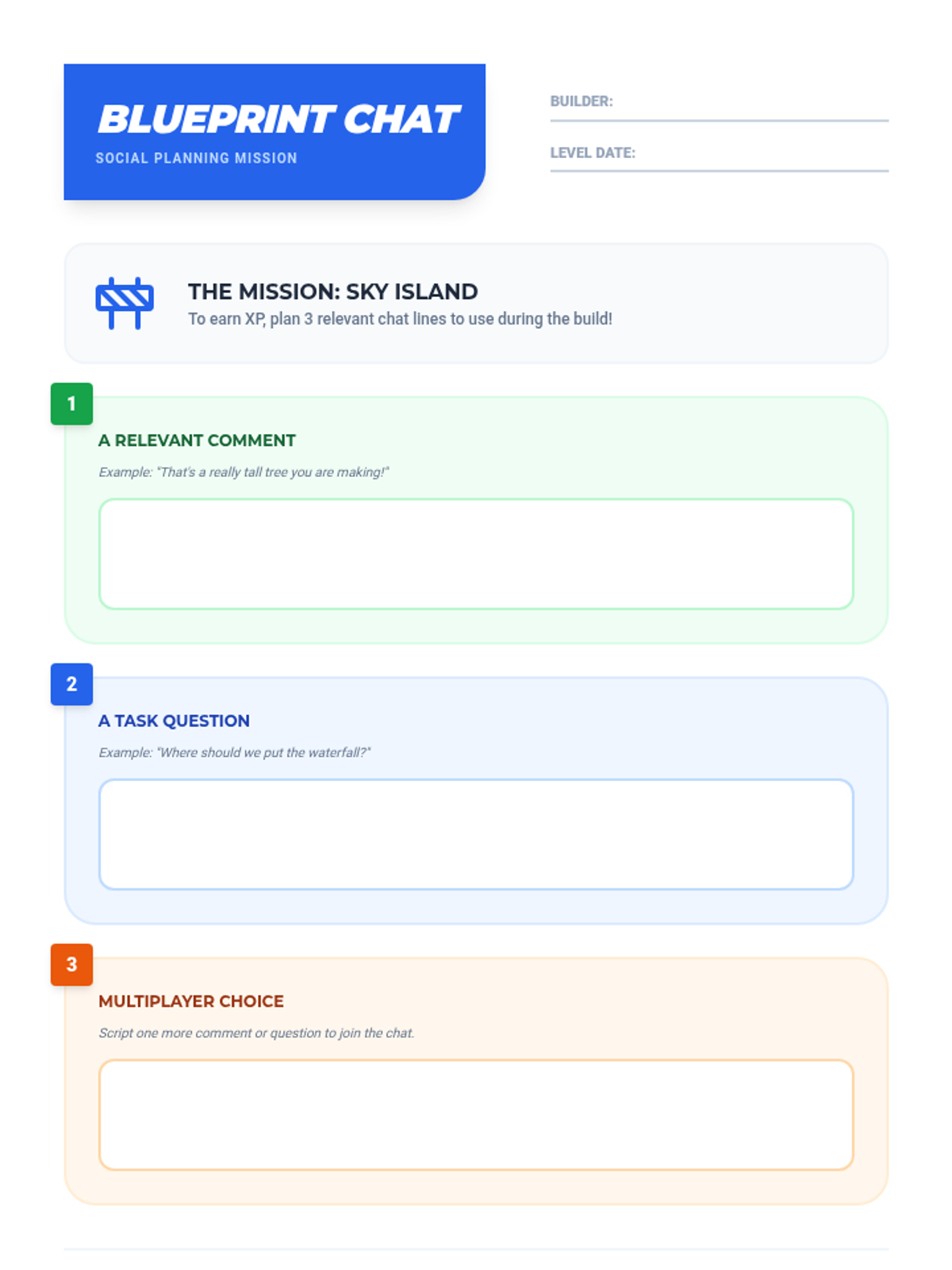 A planning worksheet for lesson 3 where students script and track three social initiations (comments and questions) during a collaborative task.