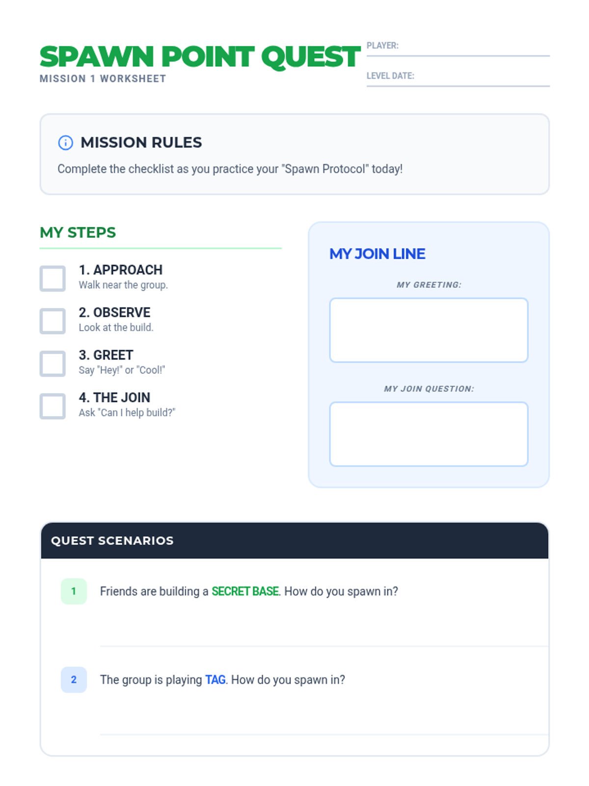A student worksheet for practicing and tracking the 'Spawn Protocol' steps during social initiation activities. Includes checklists and scripted work areas.