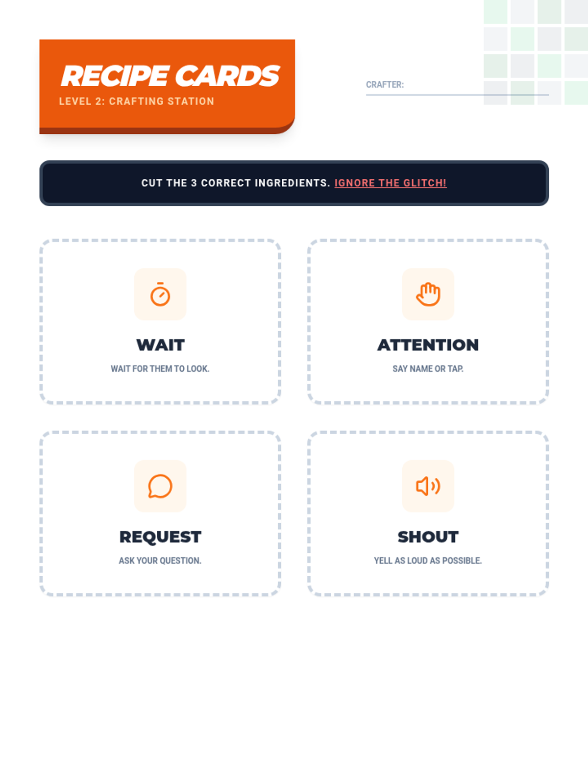 A slide deck for lesson 2, illustrating the 'Help Recipe' (Attention, Ask, Wait) and contrasting clear vs. blurry requests using Minecraft-inspired visuals.