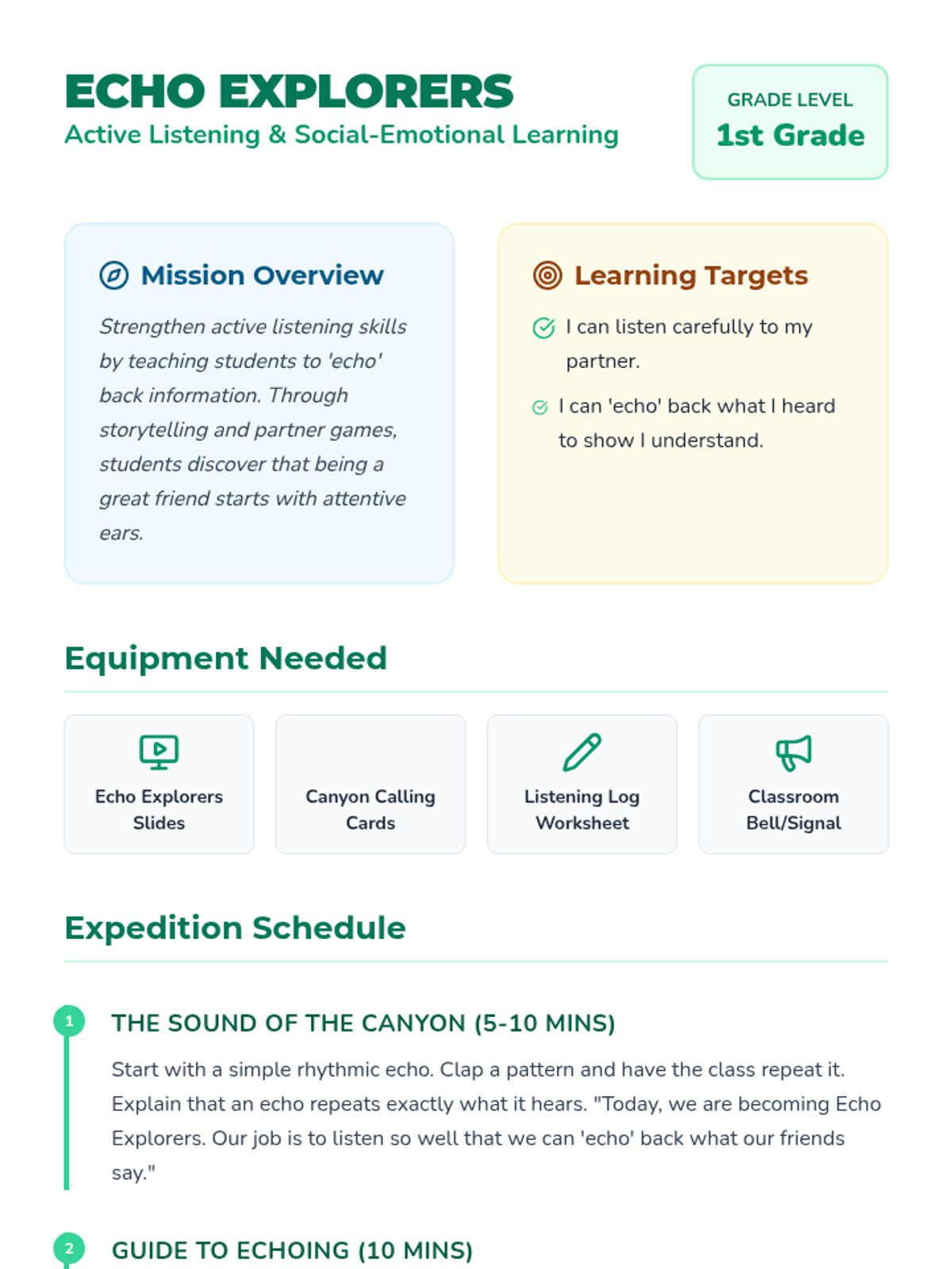 A comprehensive teacher's lesson plan for Echo Explorers, detailing the objective, materials, and step-by-step procedure for teaching active listening to 1st graders.