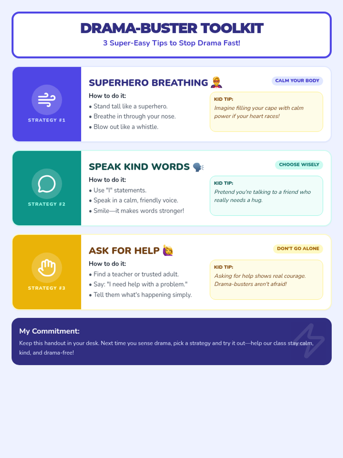 Consolidated the Avoiding Drama Strategies Handout into a single-page document by adjusting section heights, padding, and font sizes while maintaining the vibrant three-strategy layout.
