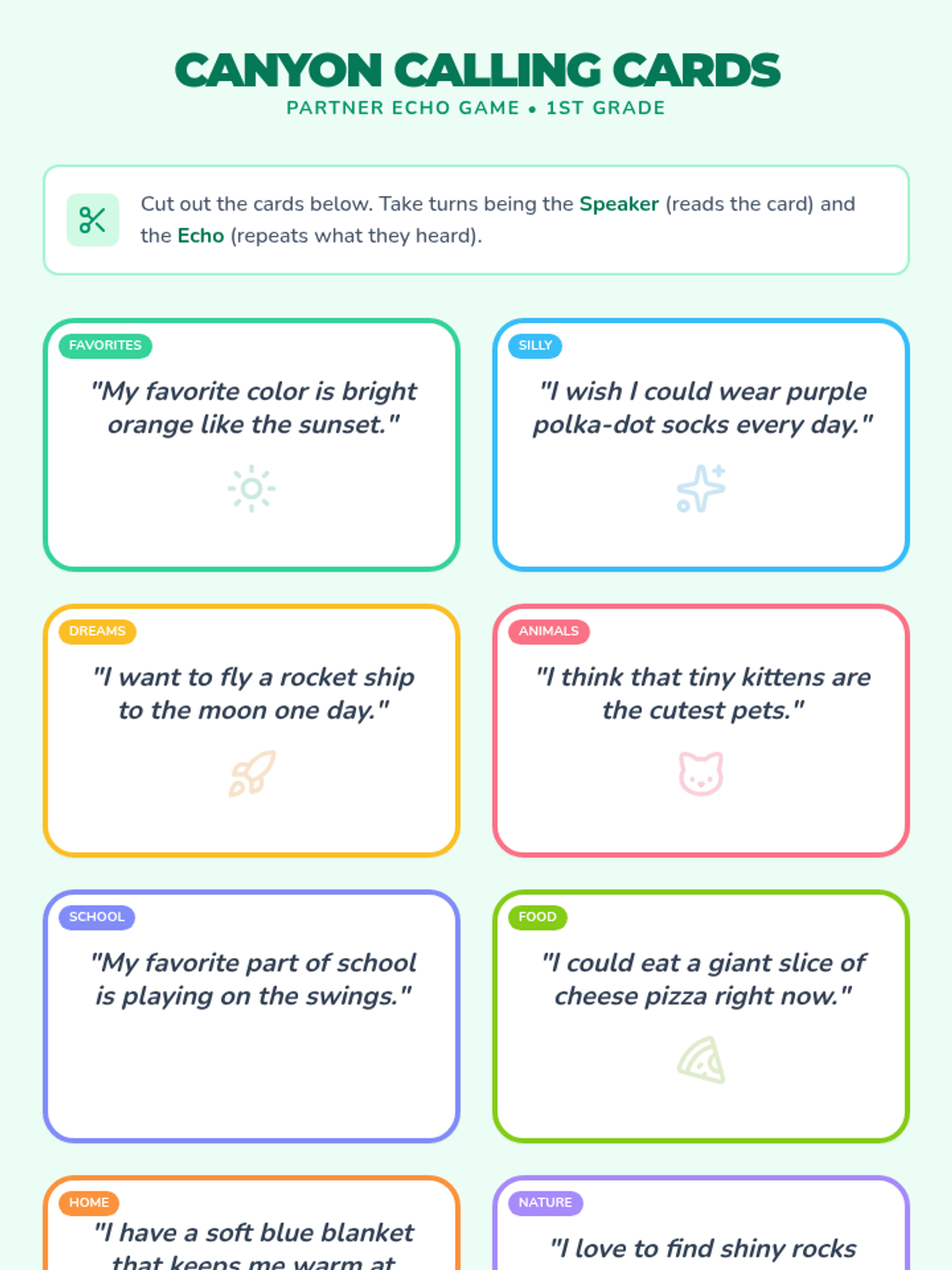 A set of printable "Canyon Calling Cards" featuring short, grade-appropriate sentences for students to practice active listening and echoing with a partner.