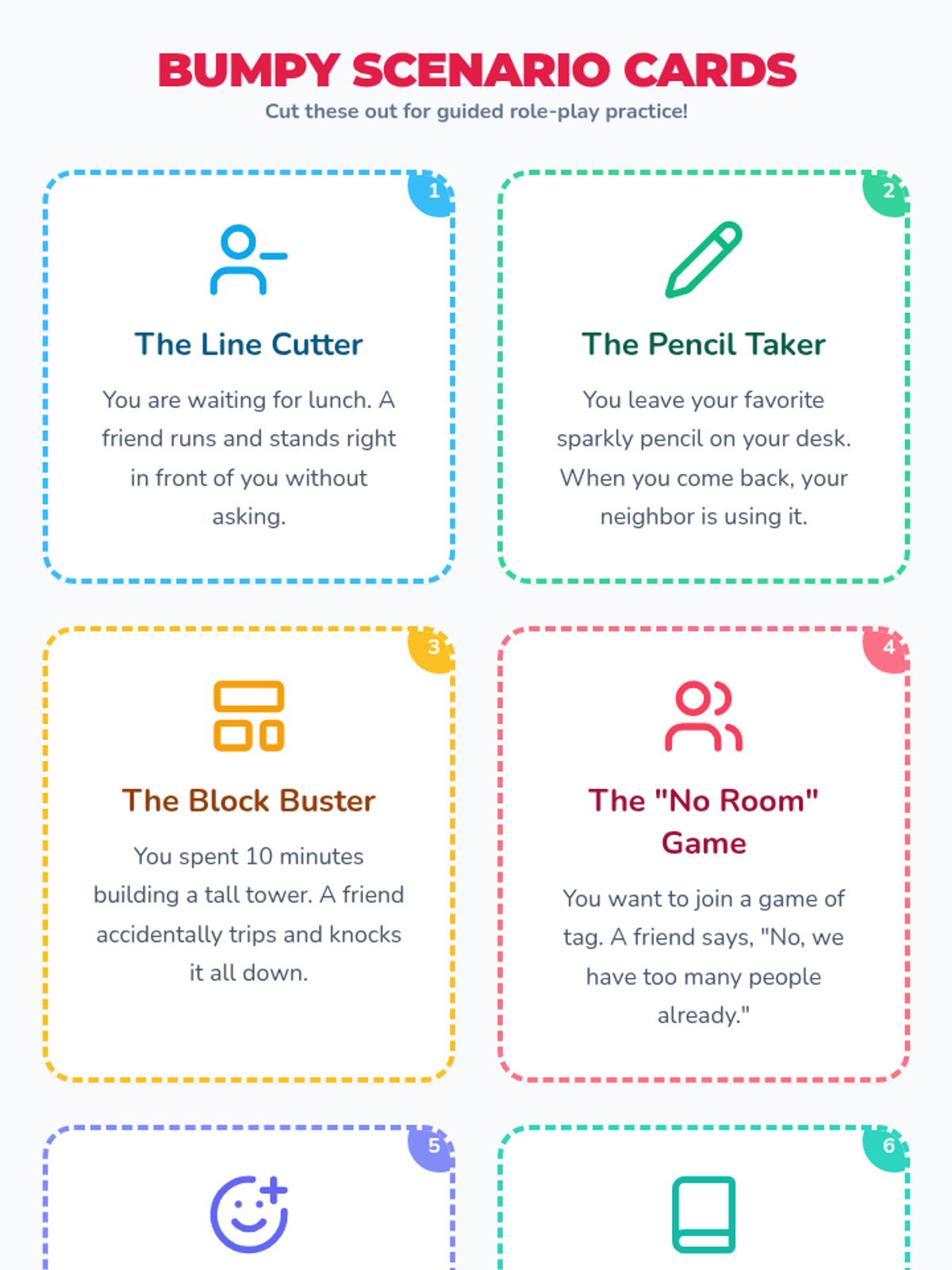 A set of six common classroom conflict scenarios for 1st graders to practice resolving using the Peace Path steps.