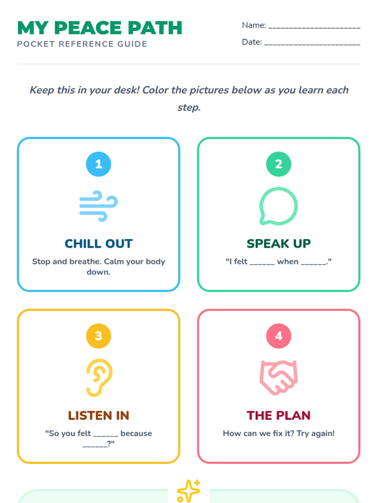 A student-facing reference handout featuring the four steps of the Peace Path, designed for coloring and inclusion in a student's desk or binder.
