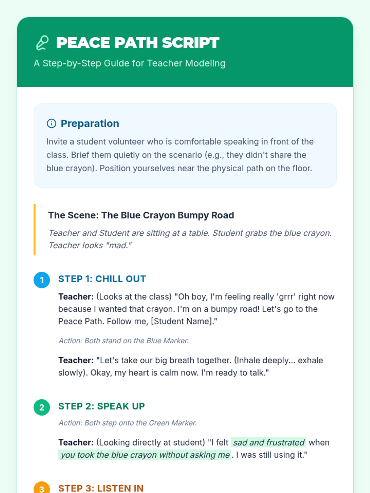 A guided instructional script for teachers to model the Peace Path process with a student, focusing on the dialogue and actions for each of the four steps.