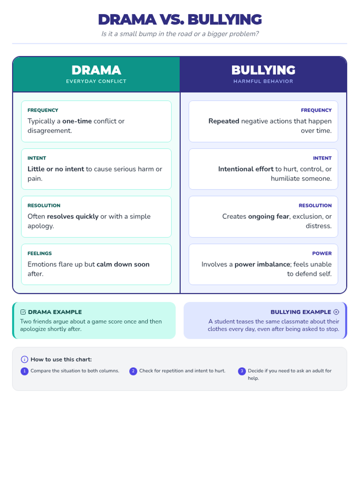 Consolidated the Drama vs Bullying Chart to fit comfortably on a single 8.5"x11" page by refining margins, padding, and text sizing while maintaining the side-by-side comparison layout.