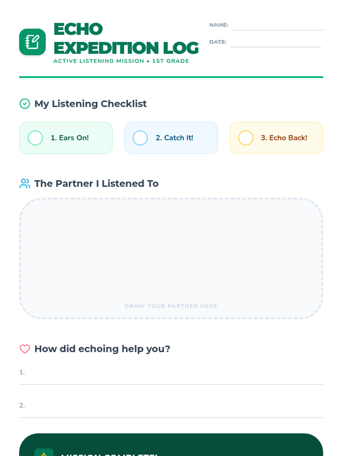 A reflective student worksheet for 1st graders to record their active listening practice. Includes a drawing area for their partner and space to reflect on the 'echoing' steps.
