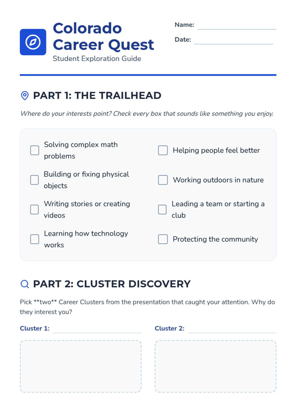 A 2-page student worksheet for 7th graders to explore their career interests, research specific Colorado clusters, and reflect on their personal skills as they relate to high-demand industries.