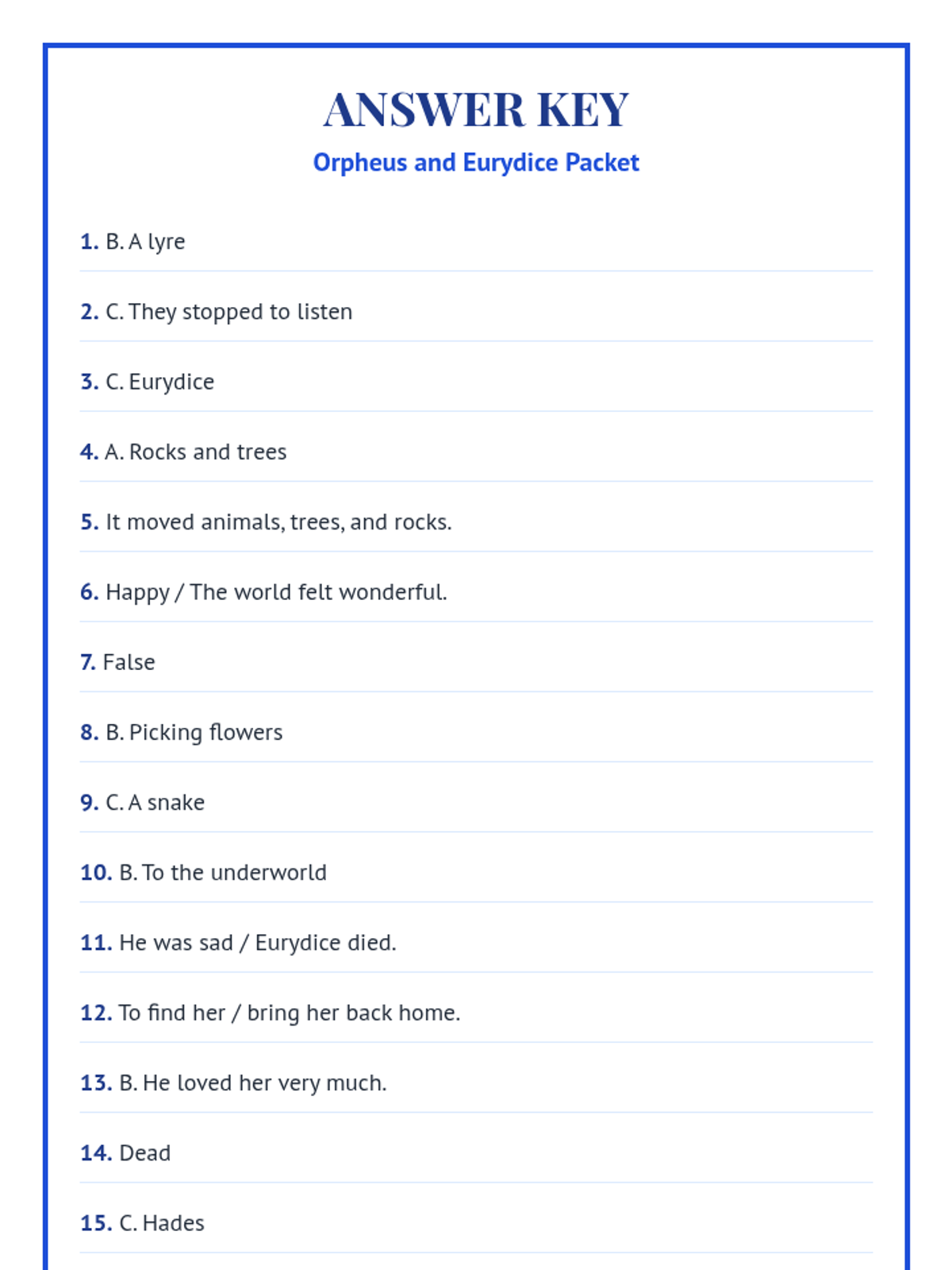 A concise answer key for the Orpheus and Eurydice Packet, providing correct answers for all 30 questions, including sample responses for the long-answer planning and writing sections.