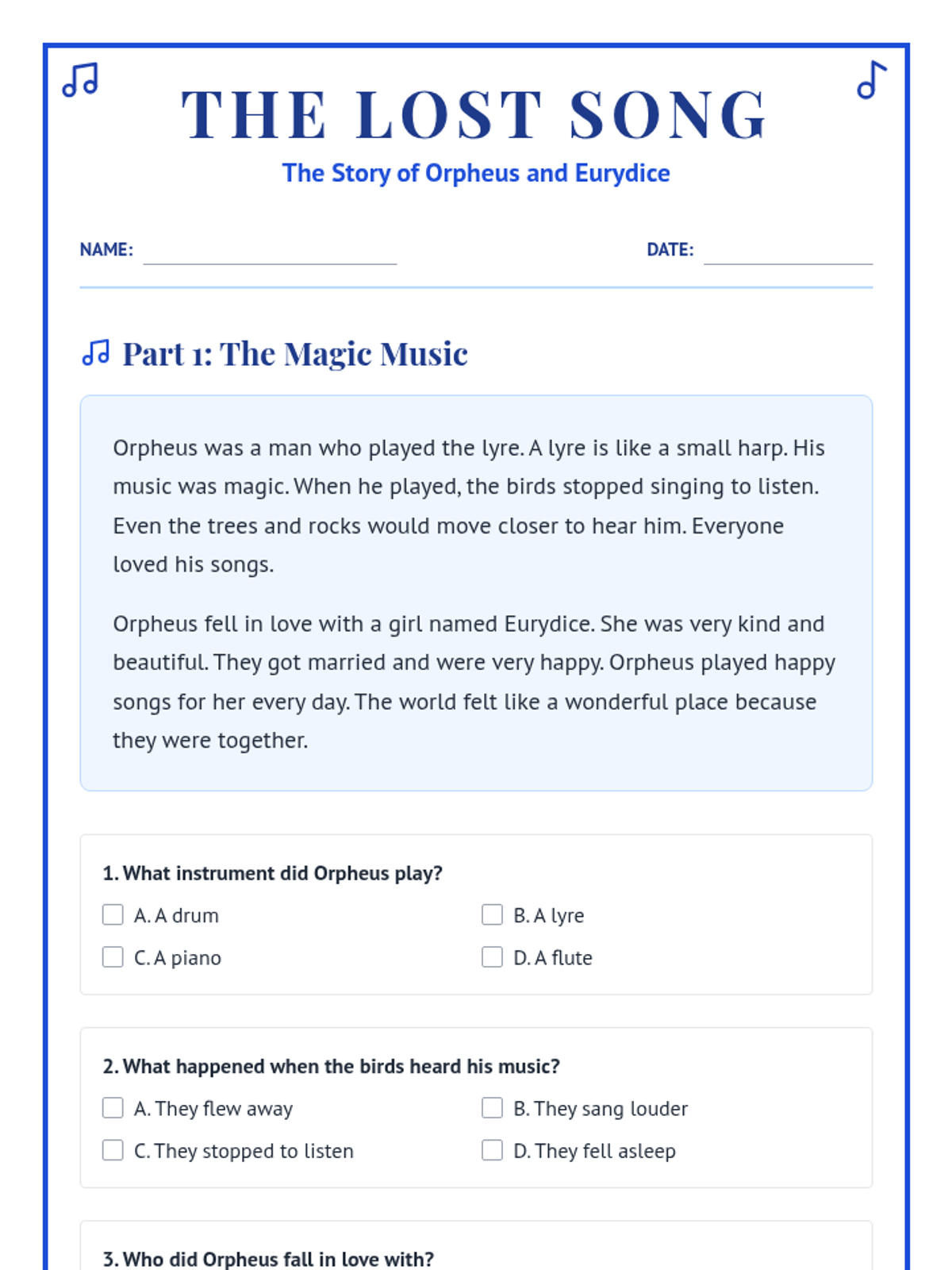 A six-page independent work packet about Orpheus and Eurydice, featuring four simplified texts, 30 comprehension questions (multiple choice and short answer), and a multi-step long answer planning and writing section. The layout uses blue, Greek-inspired visual elements and a 2nd-grade reading level to ensure accessibility.