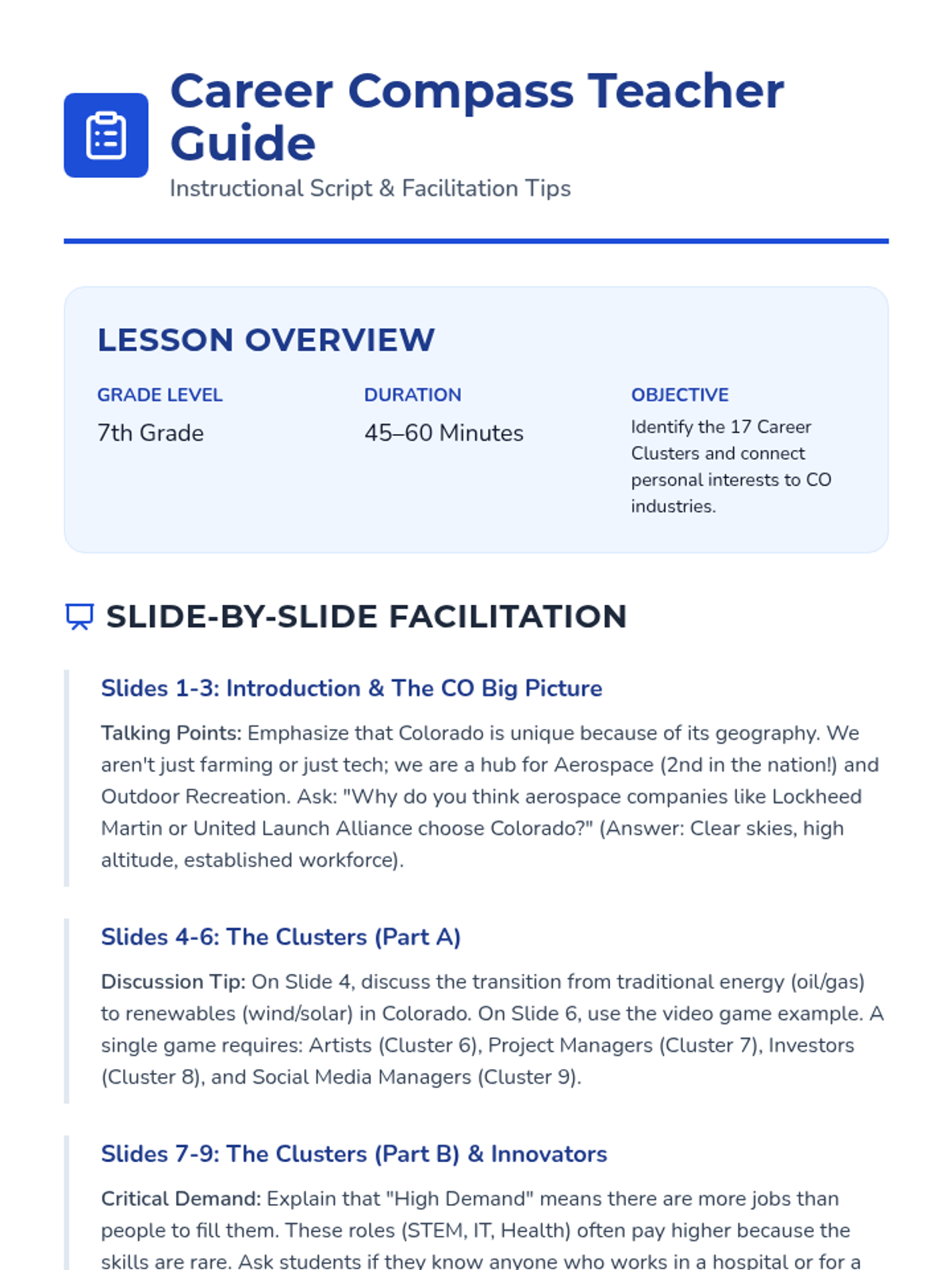 A comprehensive teacher guide for facilitating the Colorado Career Compass lesson. Includes talking points for every slide, discussion prompts, and guidance for supporting students as they complete the Career Quest worksheet.
