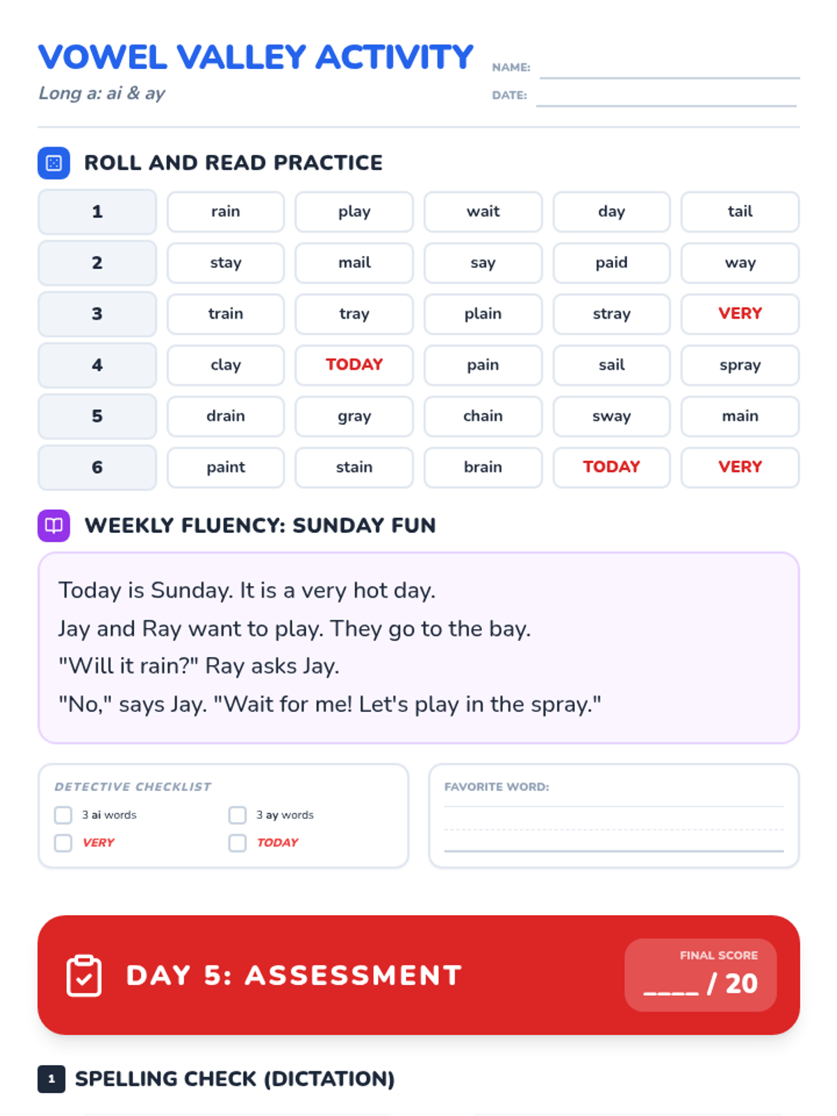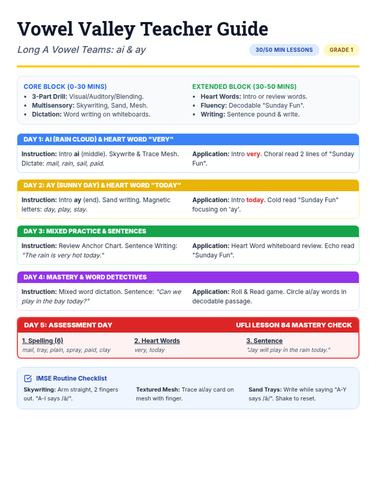 A condensed, teacher-friendly 5-day guide for vowel teams 'ai' and 'ay' following the IMSE/UFLI framework. Features 30/50 min splits and a clear assessment day checklist.