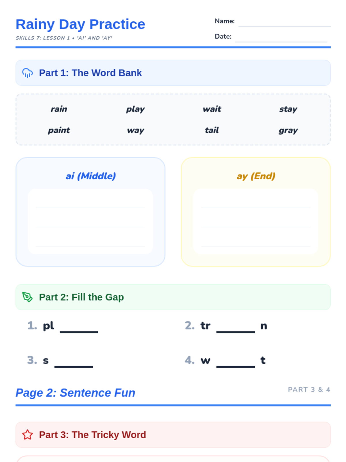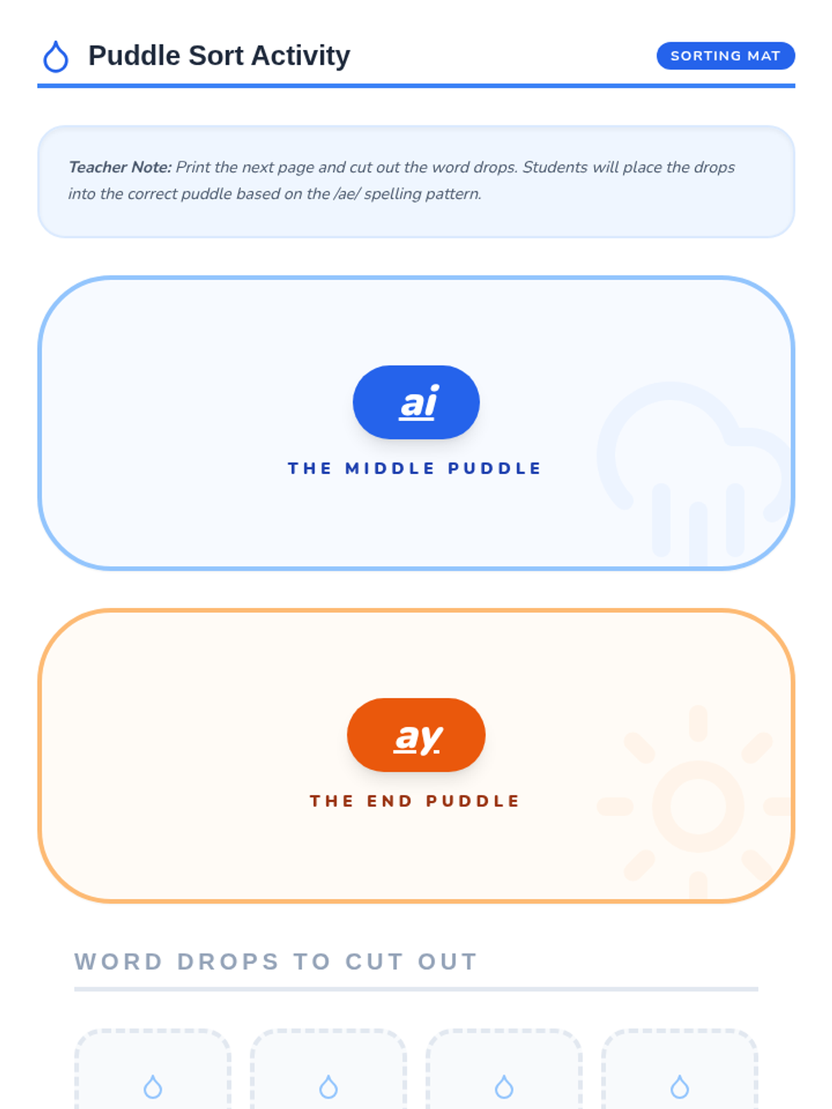 A hands-on word sorting activity where students categorize 'ai' and 'ay' words into "The Middle Puddle" or "The End Puddle" to reinforce spelling rules.