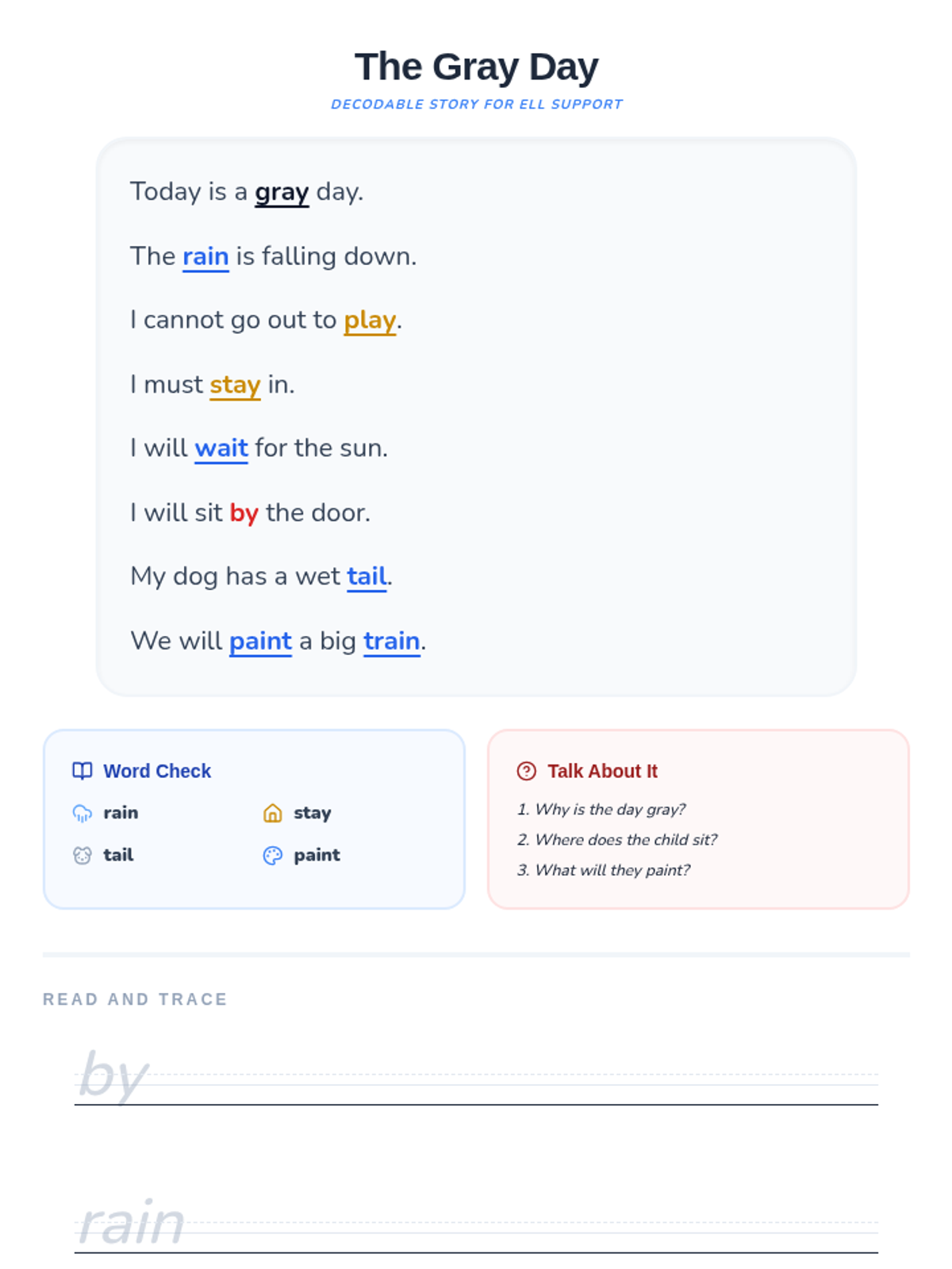 A decodable reading passage specifically designed for ELL students, featuring high-frequency /ae/ words, visual supports, and guided discussion questions.