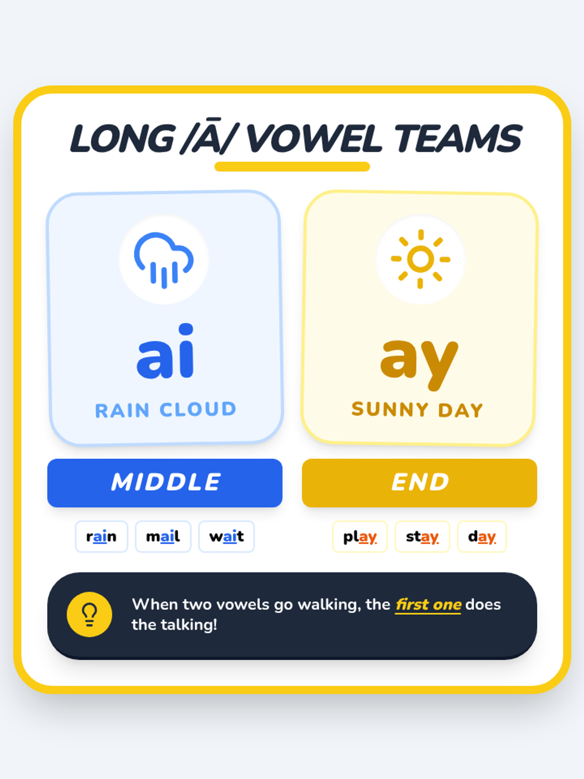 A vibrant, single-page anchor chart visually explaining the 'ai' (middle) and 'ay' (end) vowel teams with rain and sun motifs. Perfectly sized for classroom display.
