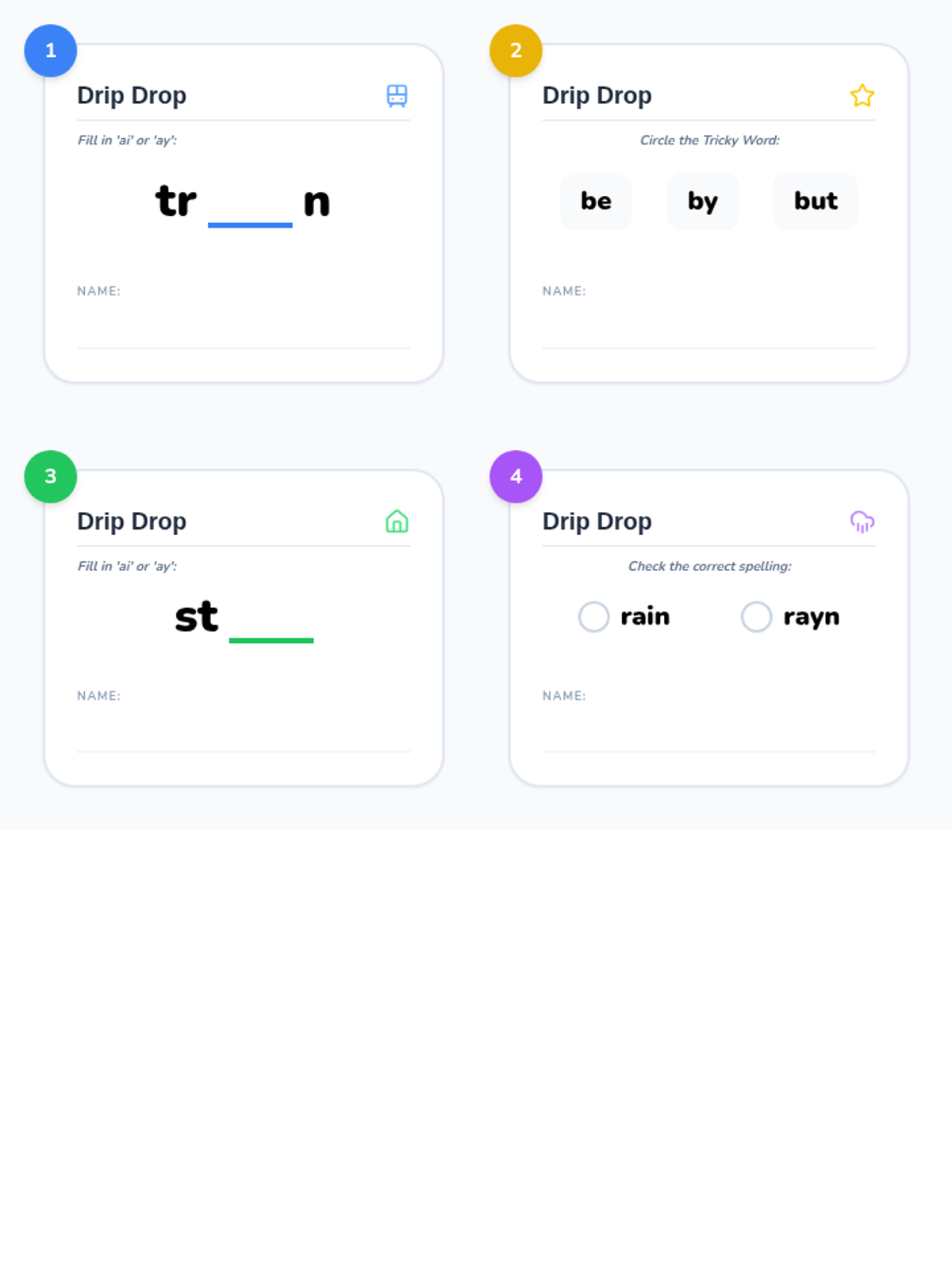 A set of four quick, printable exit tickets designed to assess student understanding of 'ai' and 'ay' spelling patterns and the tricky word 'by'.