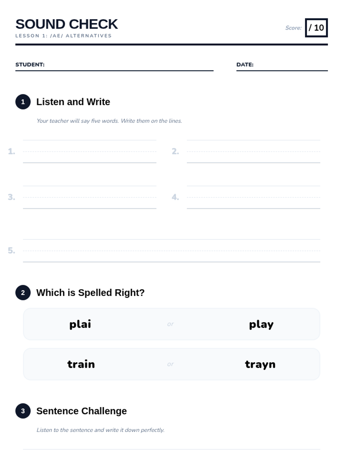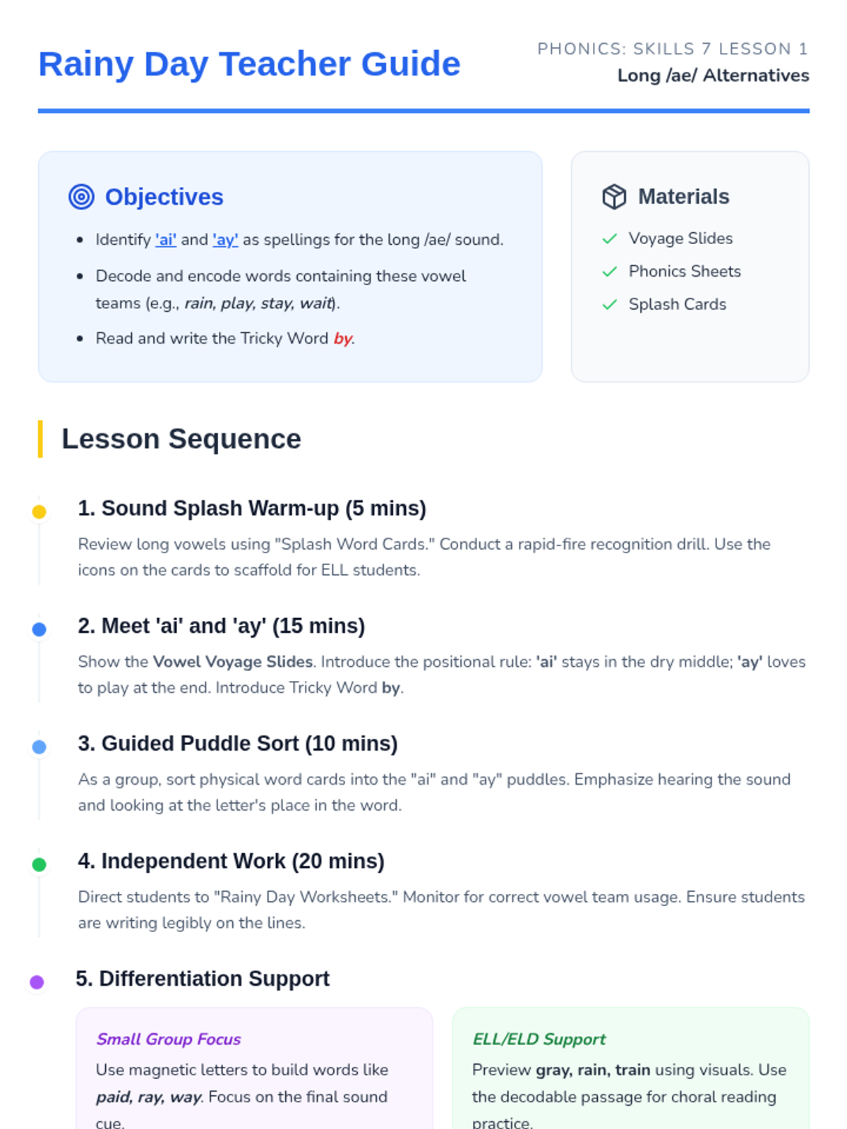A comprehensive teacher's guide for the Long /ae/ sounds lesson, featuring objectives, a step-by-step instructional sequence, assessment strategies, and common misconceptions for teaching 'ai' and 'ay' spellings.