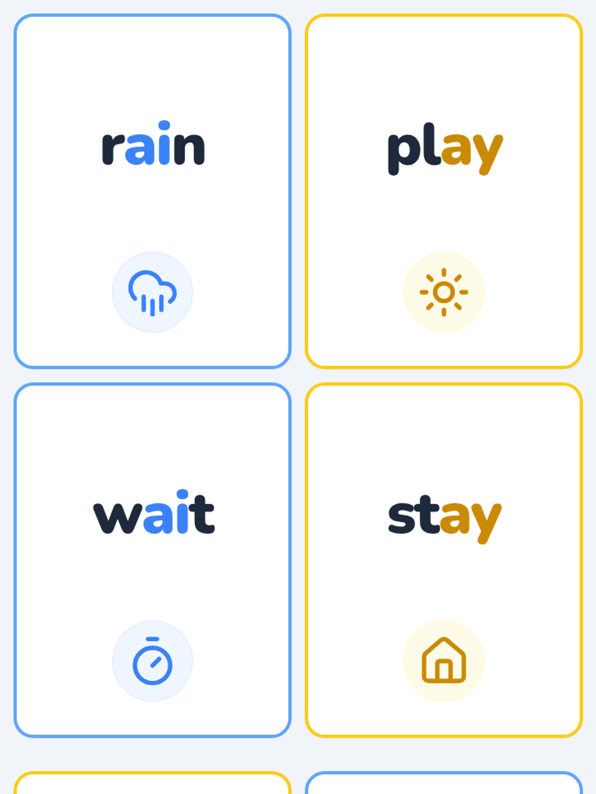 Large, clear vocabulary cards for the 'ai' and 'ay' vowel teams and the tricky word 'by', featuring color-coded spelling patterns and helpful visual icons.