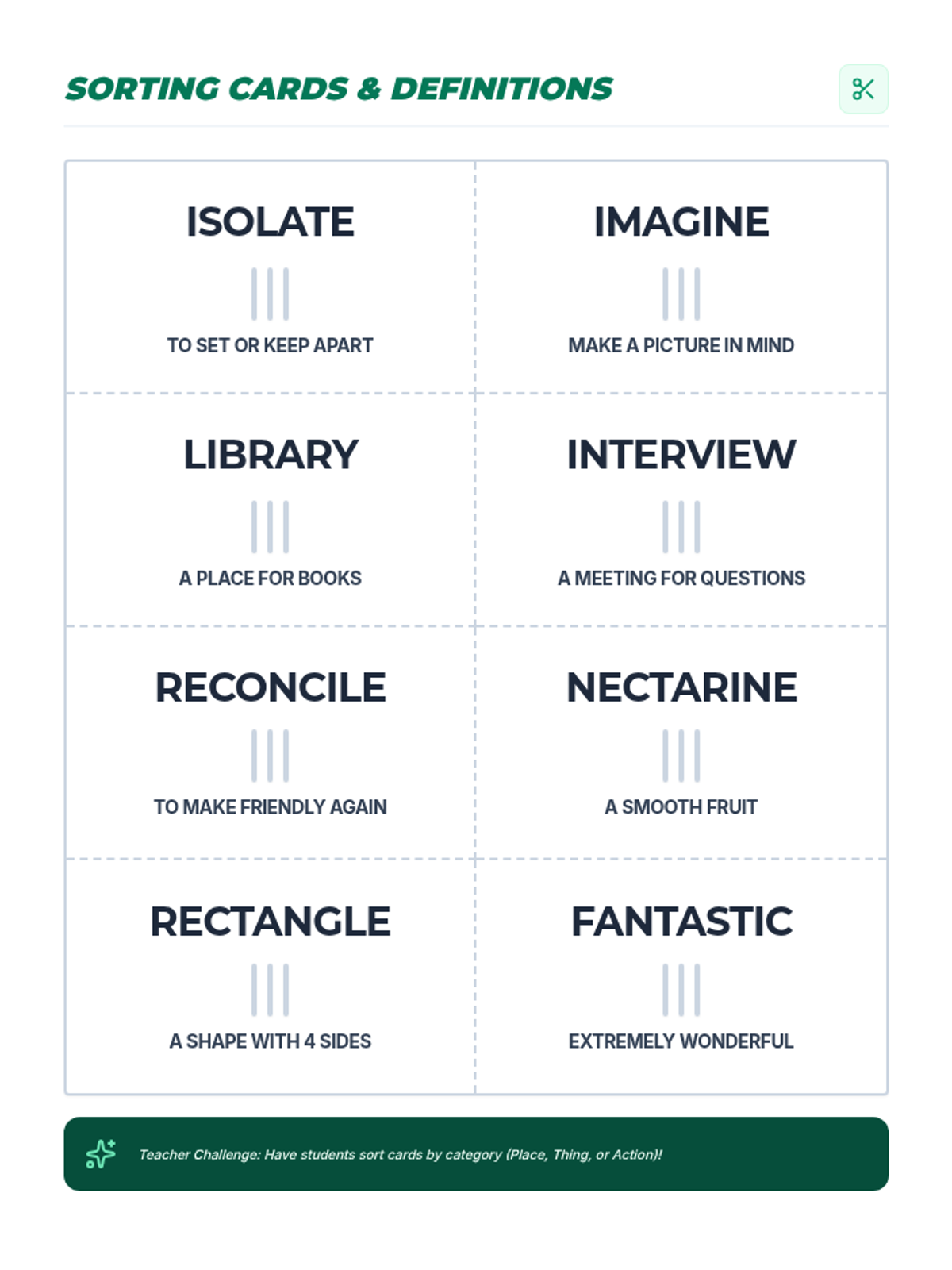 A set of 8 printable sorting cards featuring 3-syllable words and their student-friendly definitions for decoding and vocabulary practice.