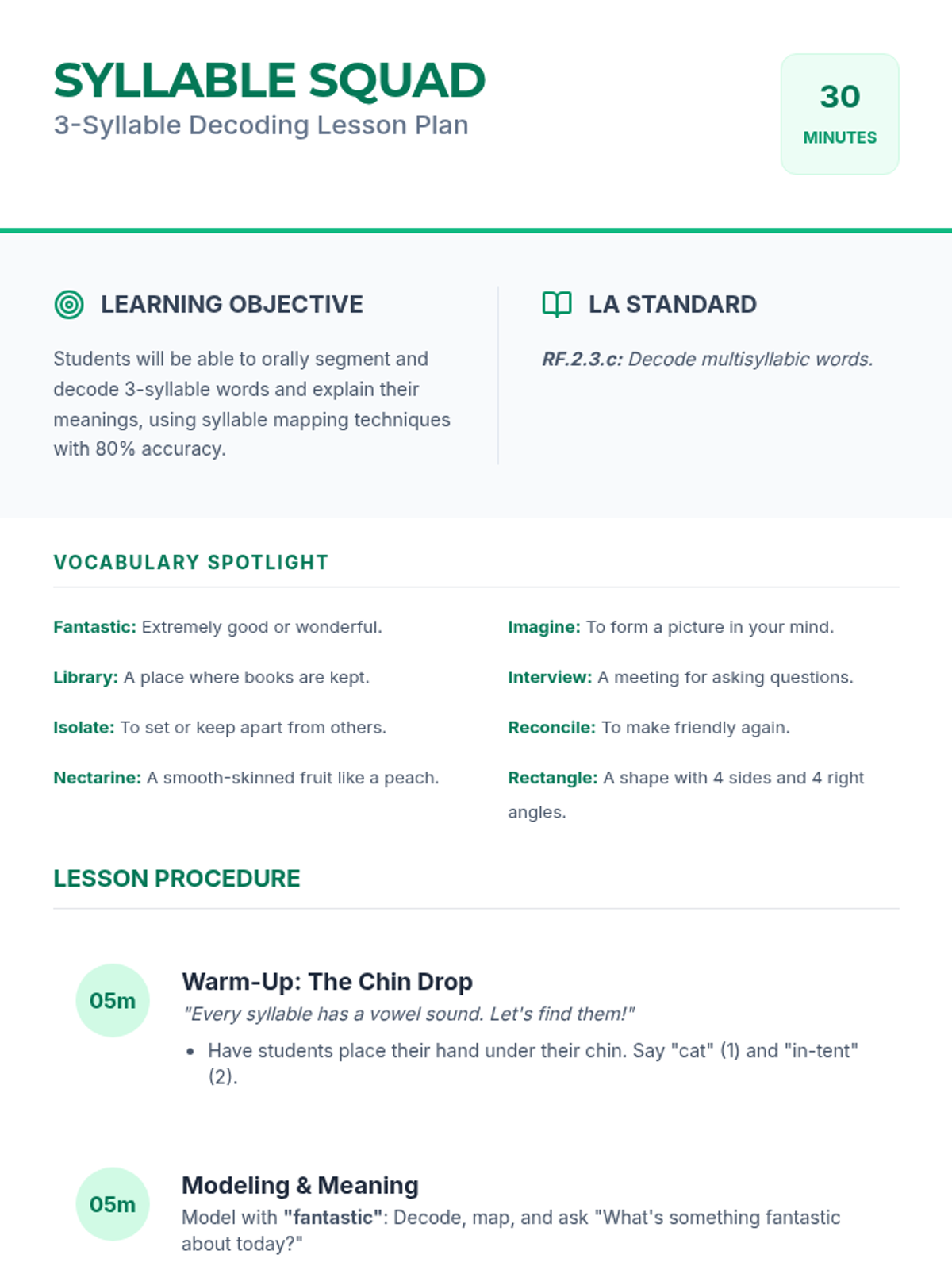 A detailed teacher lesson plan for a 30-minute small group session on decoding 3-syllable words, featuring the chin-drop method, syllable mapping, and vocabulary definitions.
