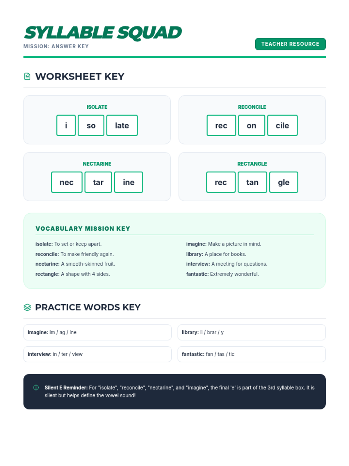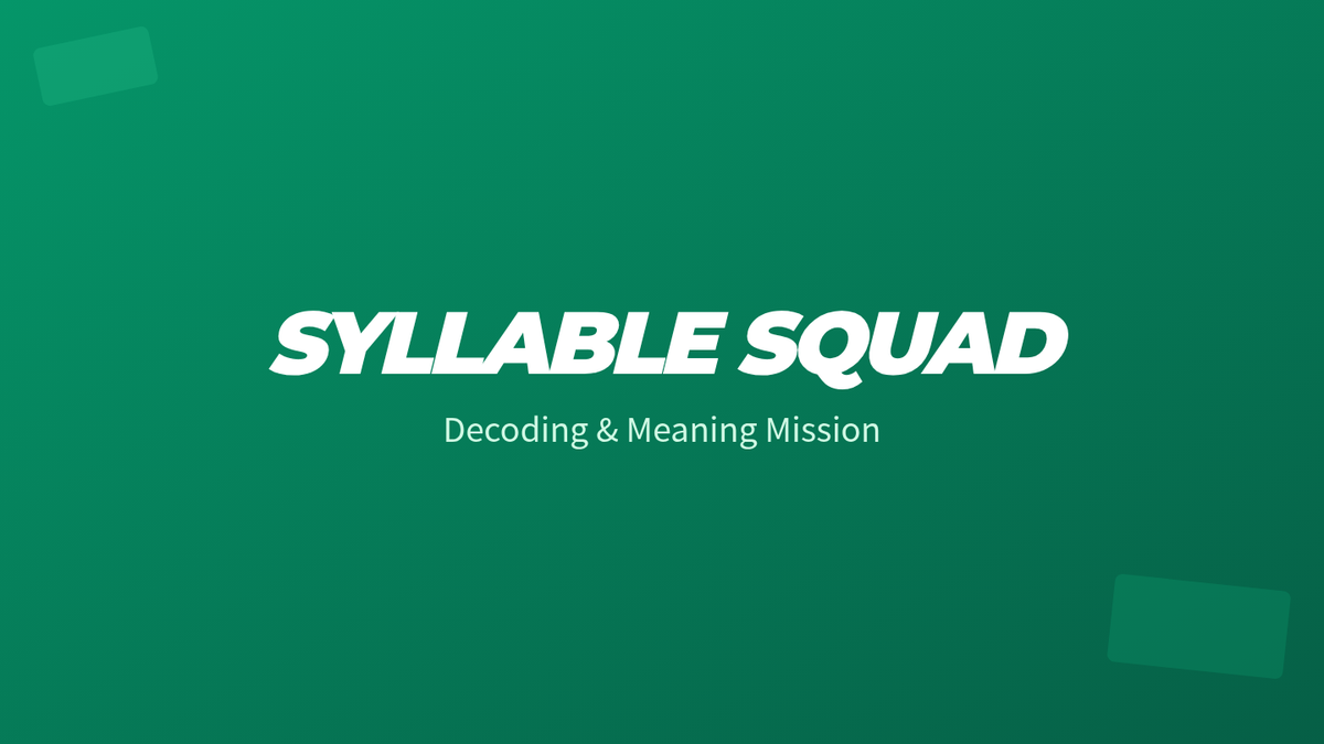 A visually engaging slide deck to support the 30-minute decoding lesson. It includes clear modeling for syllable mapping and definitions for practice words (fantastic, imagine, library, interview).