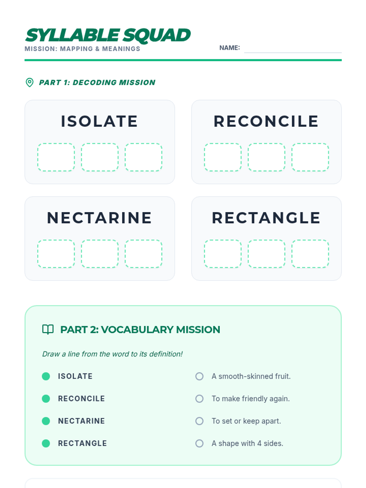 A student worksheet for practicing 3-syllable word mapping and vocabulary meanings. Students map 4 words and match them to their student-friendly definitions.