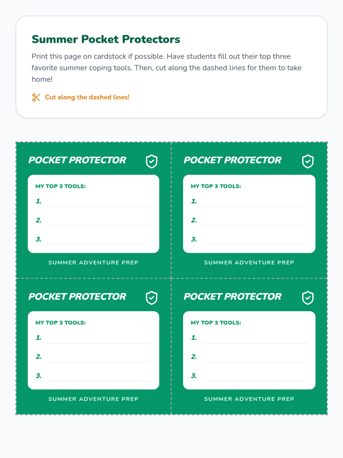 A set of small, portable 'Pocket Protector' cards for students to fill out with their top three summer coping strategies. Designed for quick reference.