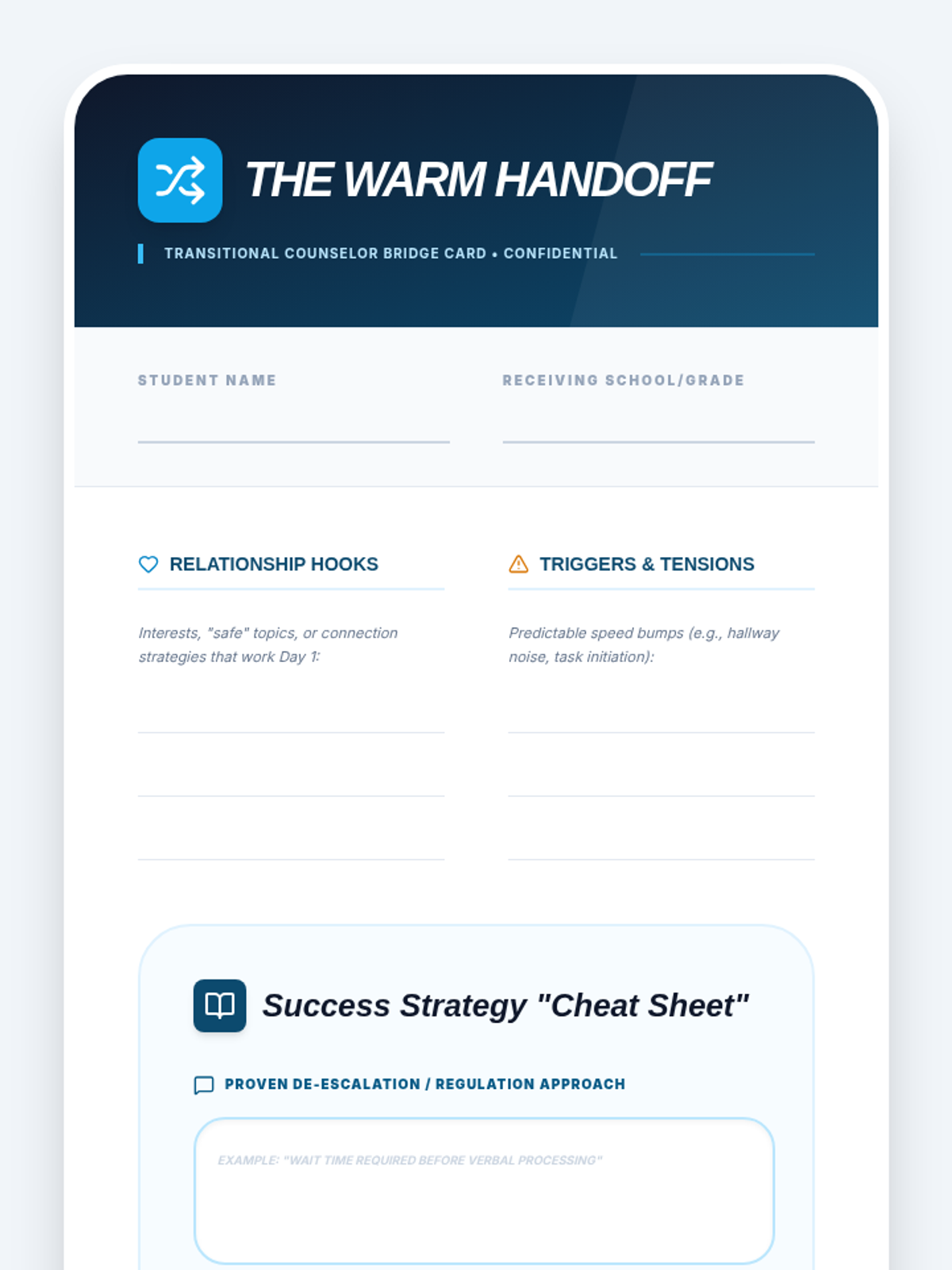 A structured professional communication template for counselors to provide a "warm handoff" of qualitative student data and successful SEL strategies to receiving school staff.