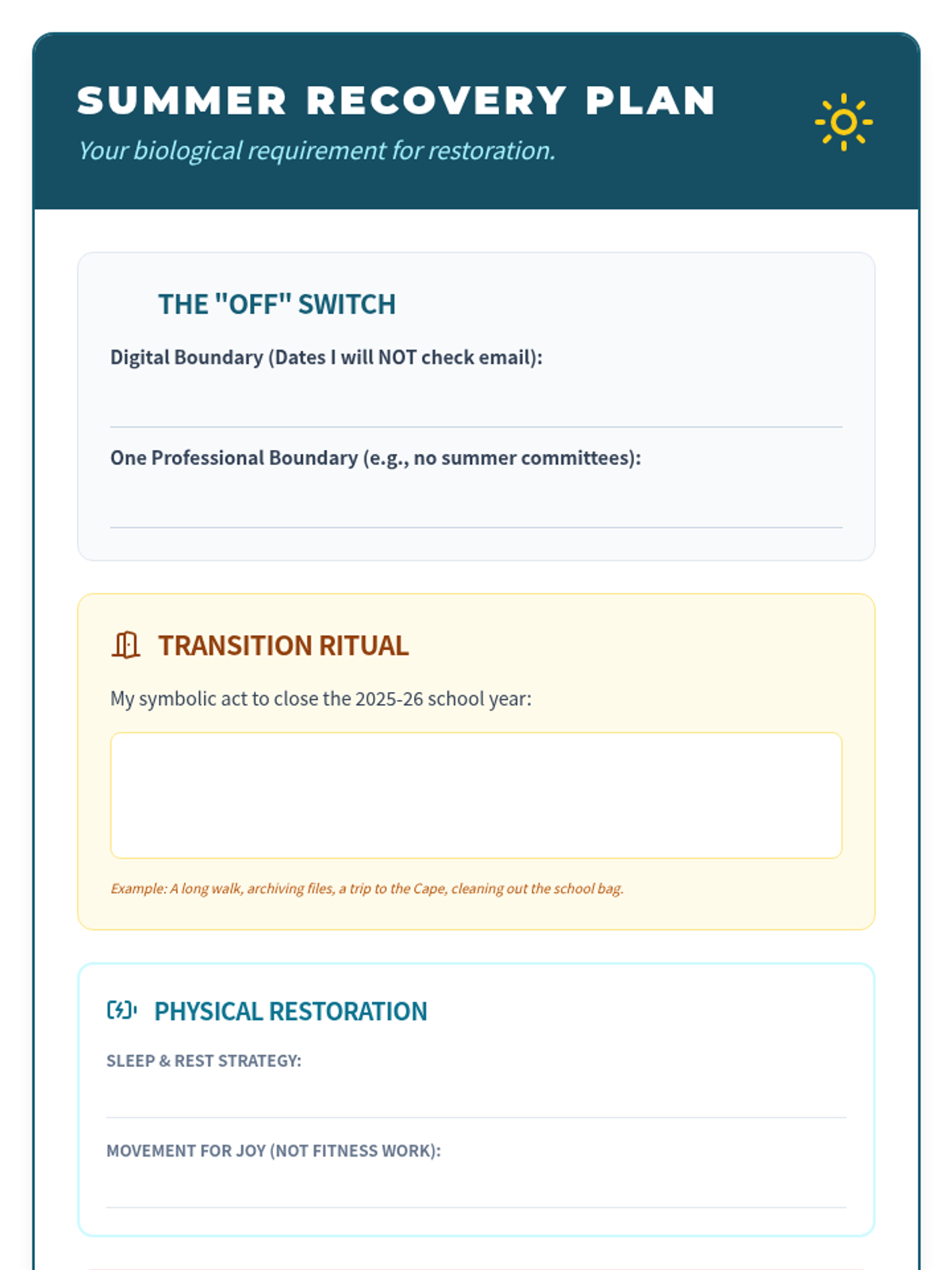 A one-page action plan template for educators to map out their summer recovery, including digital boundaries, physical restoration, social connection, and a symbolic transition ritual.