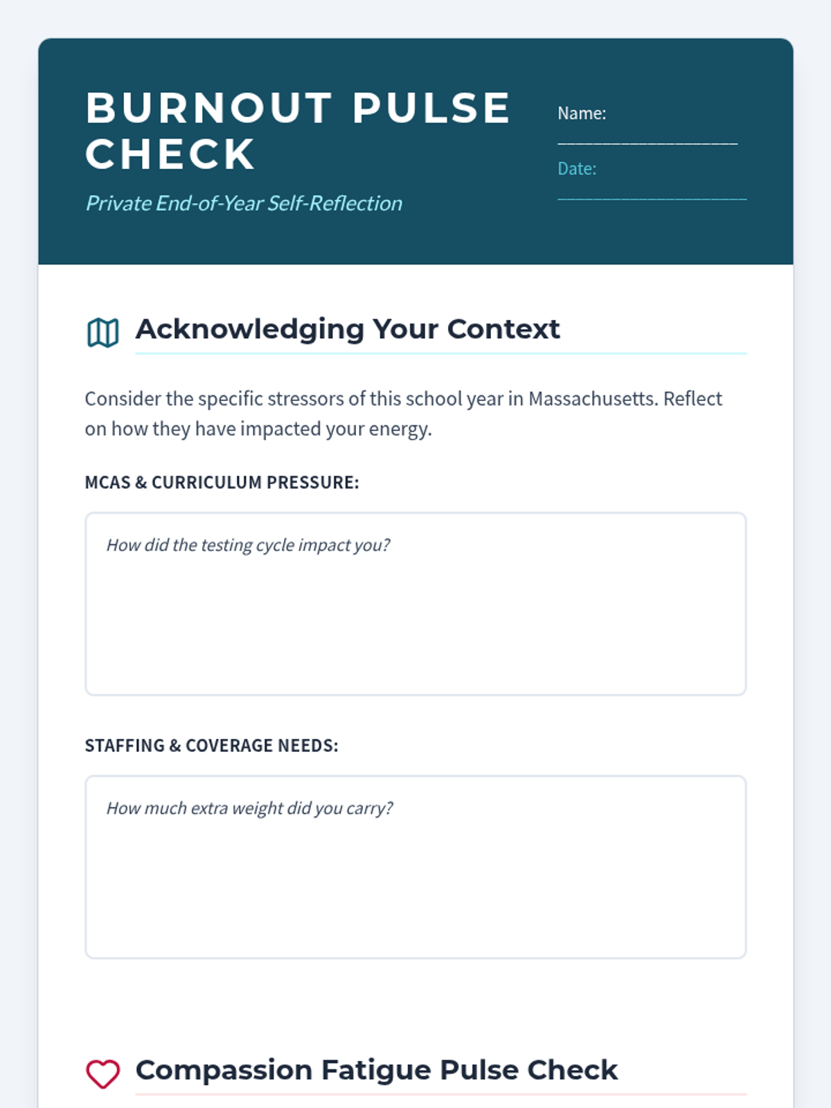 A reflective worksheet for educators to assess their levels of burnout and compassion fatigue, with specific sections for Massachusetts-specific stressors and a guided "release" activity.