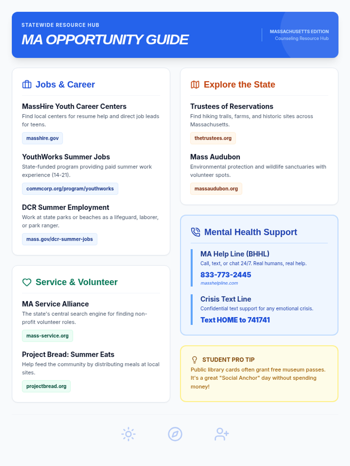 A comprehensive reference guide for Massachusetts high school students, featuring state-specific resources for jobs, volunteering, outdoor exploration, and mental health support.