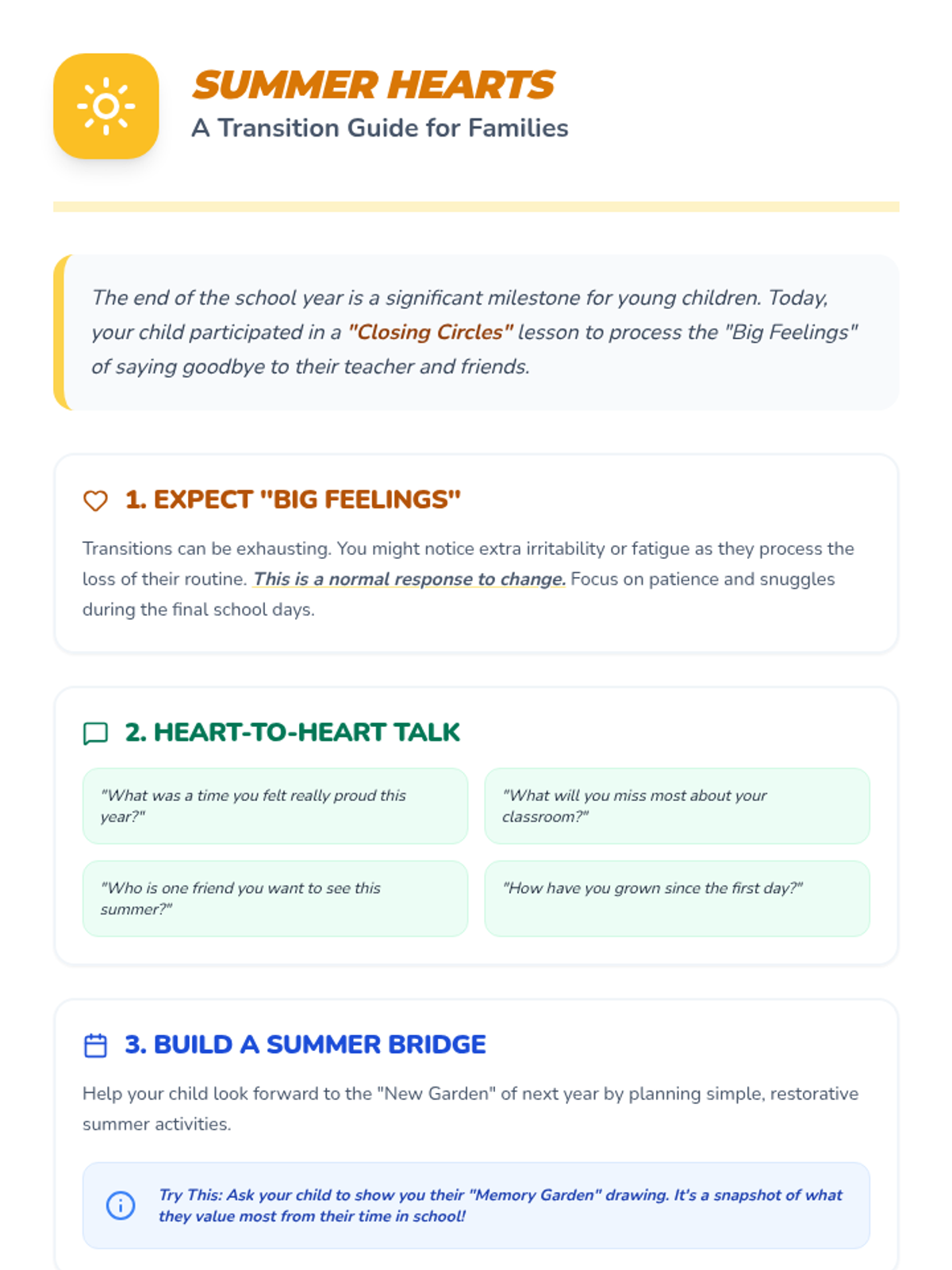 A family-facing take-home guide for parents and caregivers to help their K-2 children navigate the emotional transition from the school year to summer break. Revised for single-page consolidation and readability.
