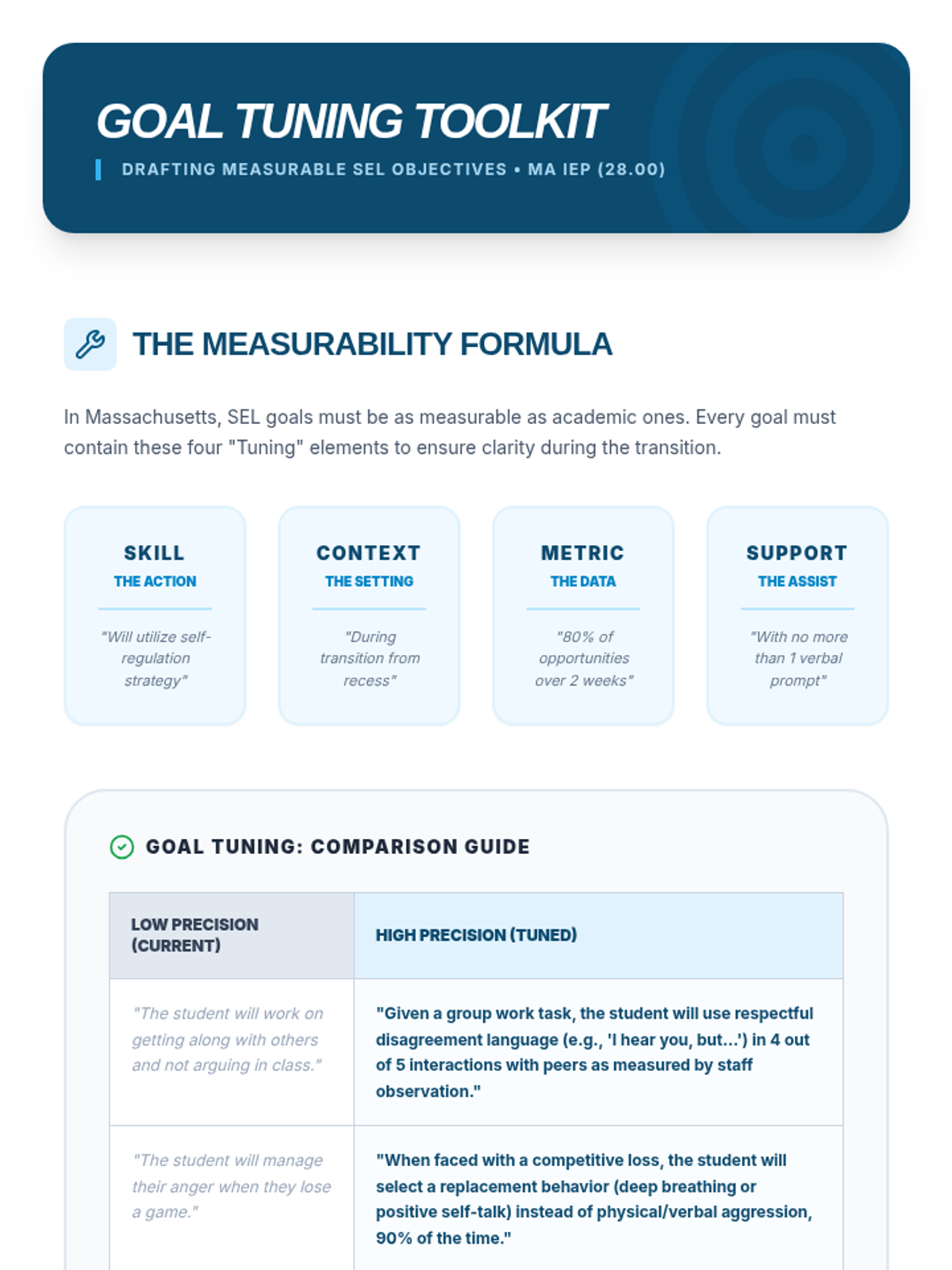 A technical worksheet for counselors to rewrite qualitative SEL goals into measurable, MA-compliant IEP objectives with benchmarks and clear data metrics.