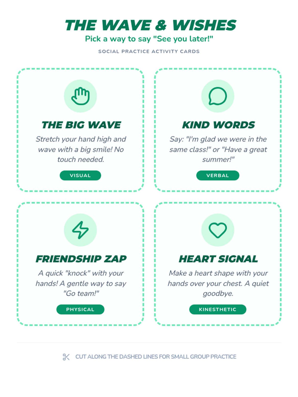 A set of printable activity cards for K-2 students to practice different ways of saying goodbye, incorporating visual, verbal, and kinesthetic responses. Revised to fit onto a single page and use valid icons.