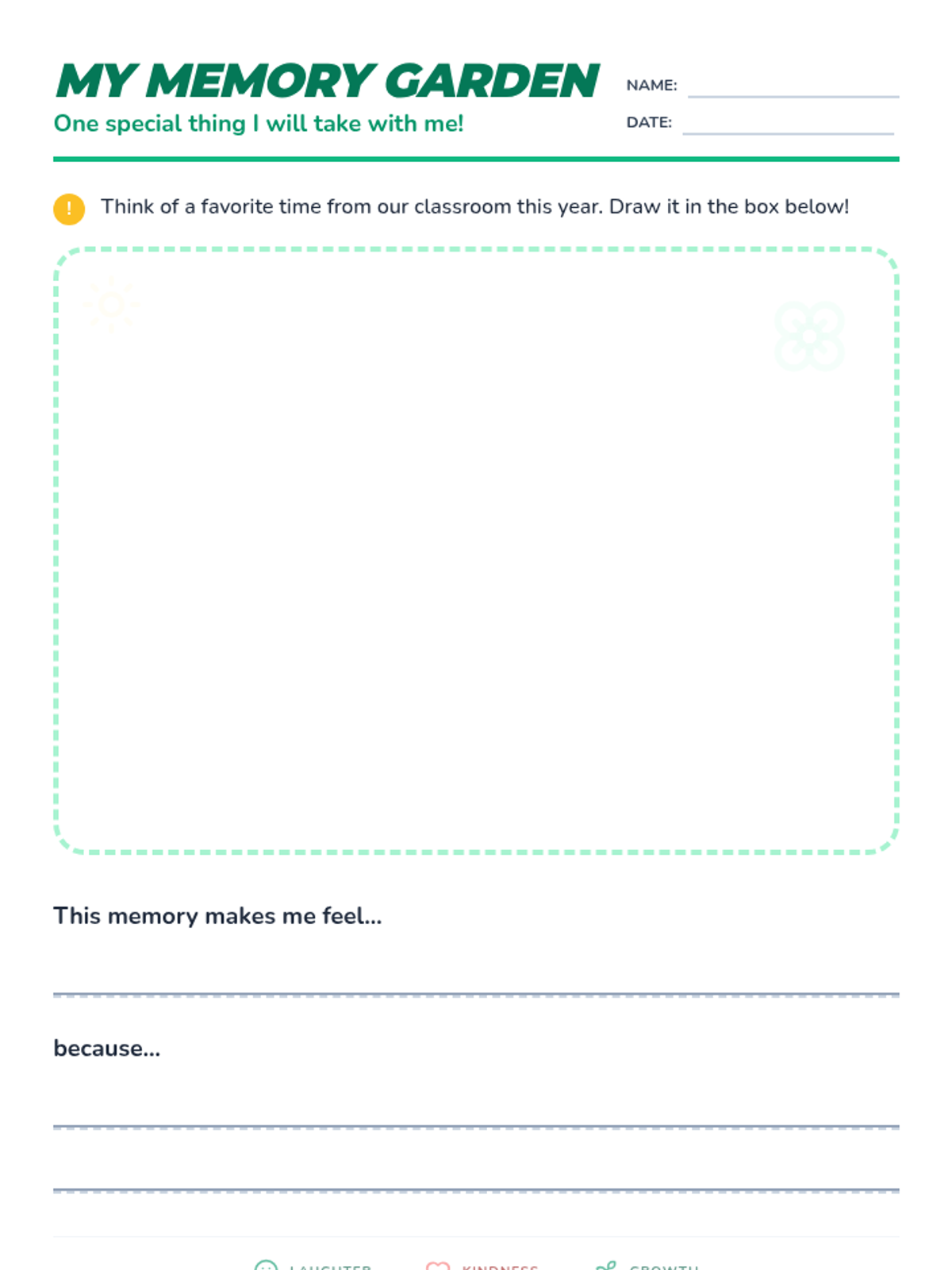A student worksheet for K-2 students to draw and describe their favorite memory from the school year as part of the emotional transition process. Revised to include primary writing lines and consolidate onto one page.
