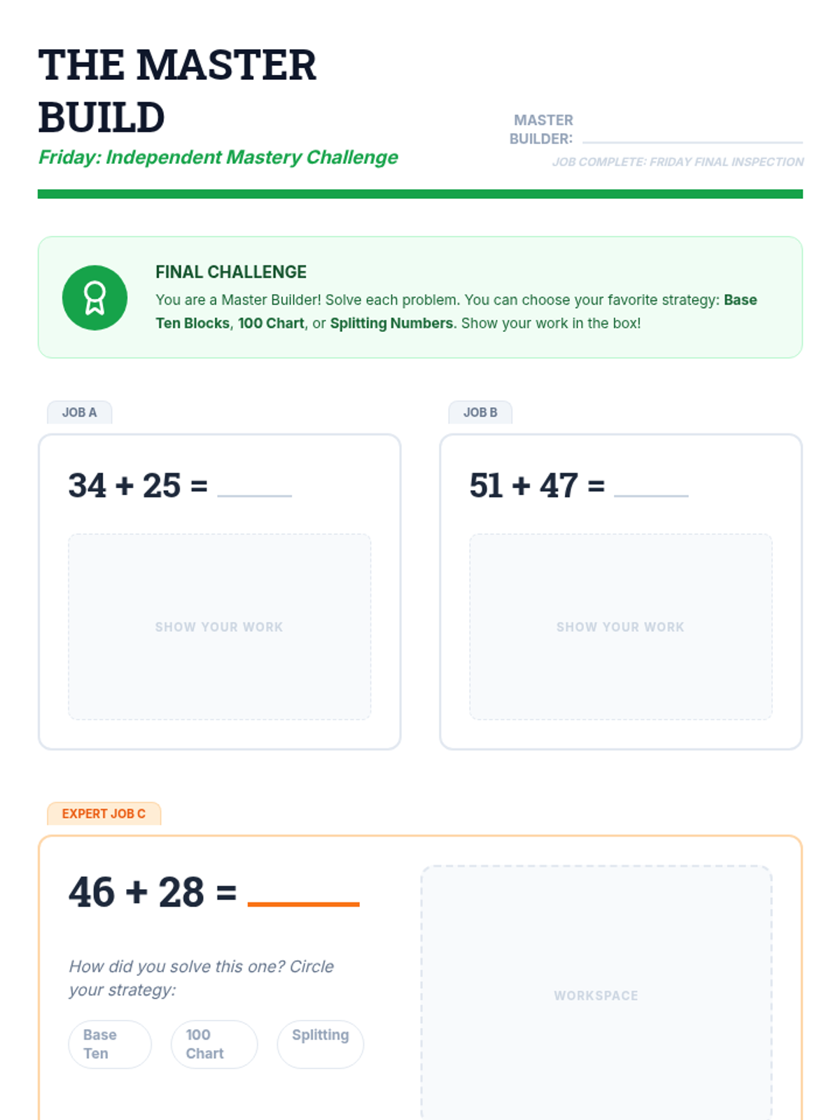 Friday's independent practice worksheet where students choose their preferred strategy to solve two-digit addition problems, including those with regrouping.