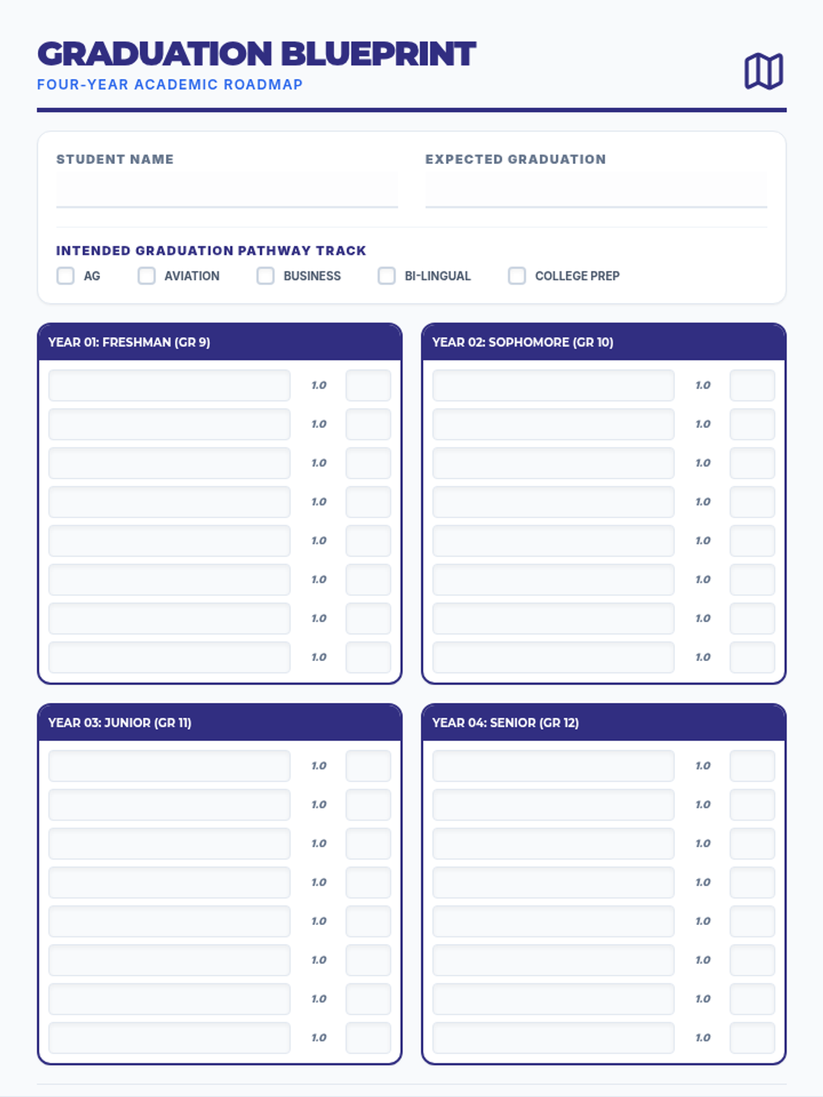 A consolidated 2-page academic planning and tracking tool that combines the 4-year roadmap with the graduation milestone checklist. Features a 4-year course planning grid on page 1 and a comprehensive credit tracker, annual audit verification, and meeting notes section on page 2. Added dedicated space for students to write specific class names for each credit requirement. Corrected font sizes for better readability.