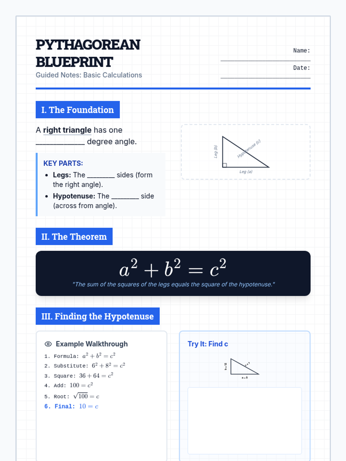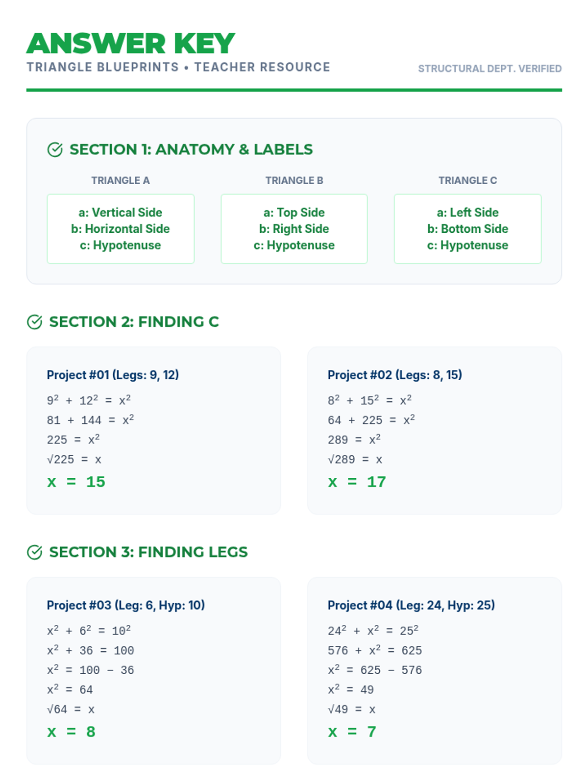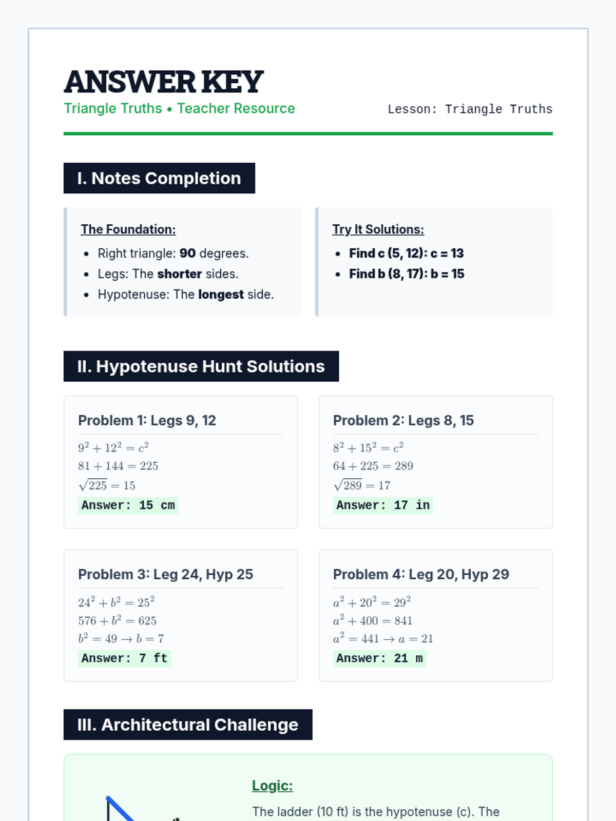 Complete answer key for the Pythagorean Blueprint notes and Hypotenuse Hunt worksheet. Updated for better math rendering, contrast, and layout.