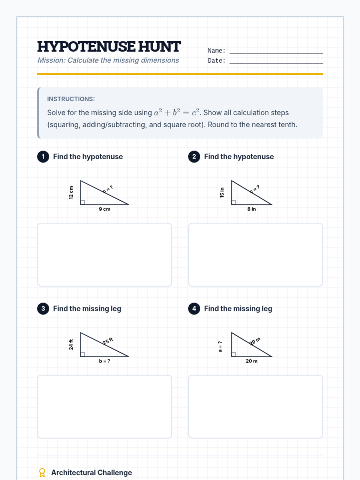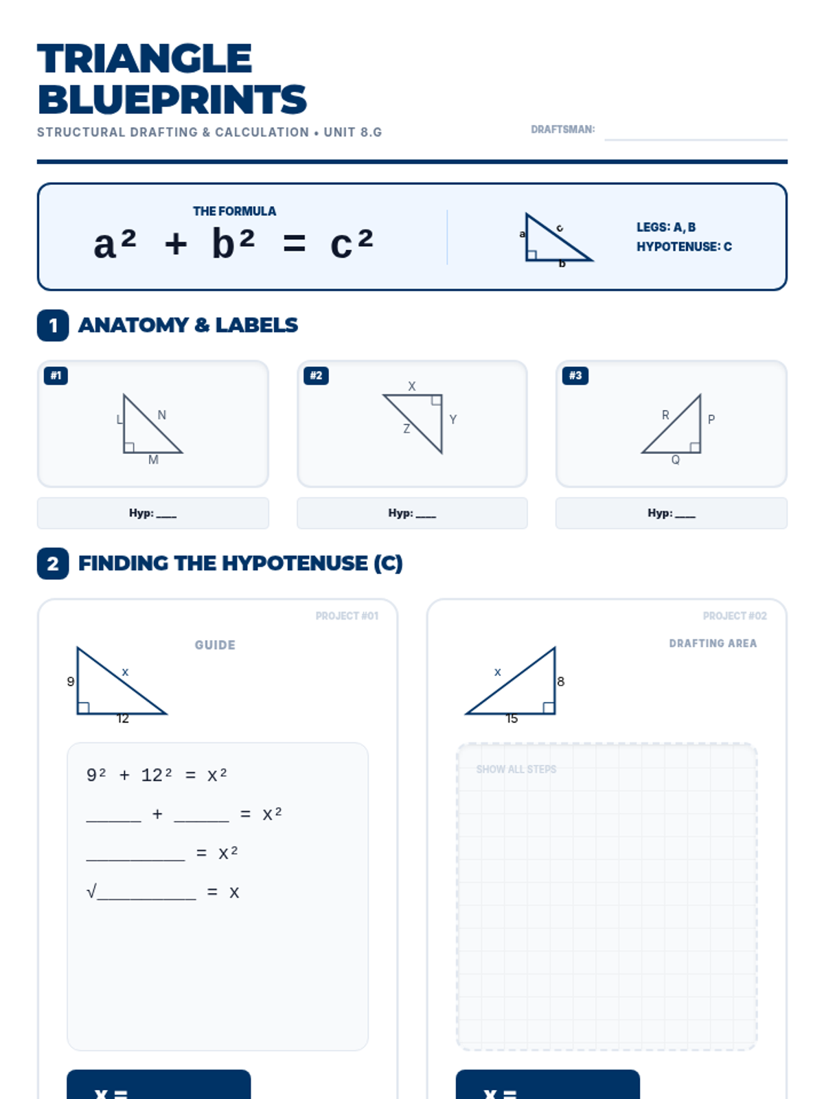 A guided practice worksheet for calculating missing sides of right triangles. The worksheet features an architectural drafting aesthetic and provides structured space for students to label triangles, solve for the hypotenuse, and solve for missing legs using the Pythagorean Theorem.