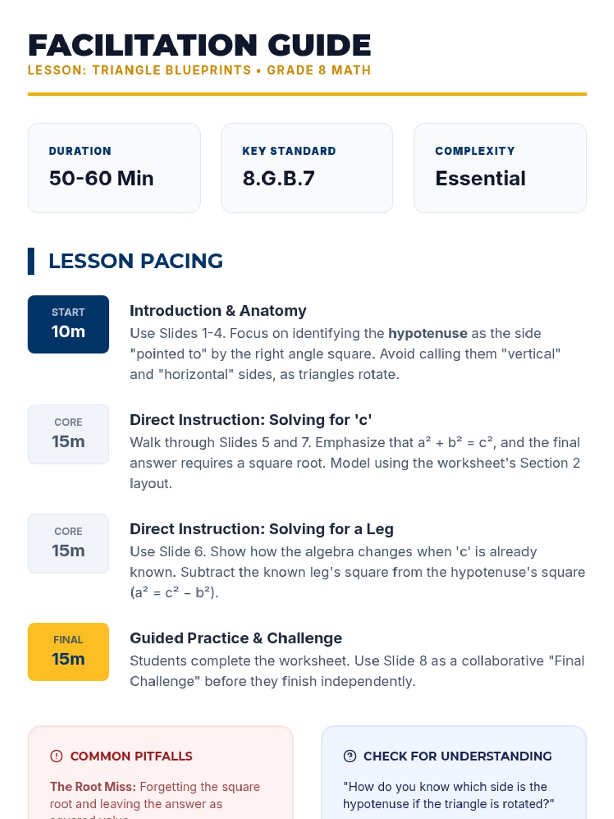A detailed facilitation guide for teachers leading the Triangle Blueprints lesson. Includes pacing suggestions, discussion prompts to check for understanding, a breakdown of common student misconceptions, and a reference table of common Pythagorean triples.