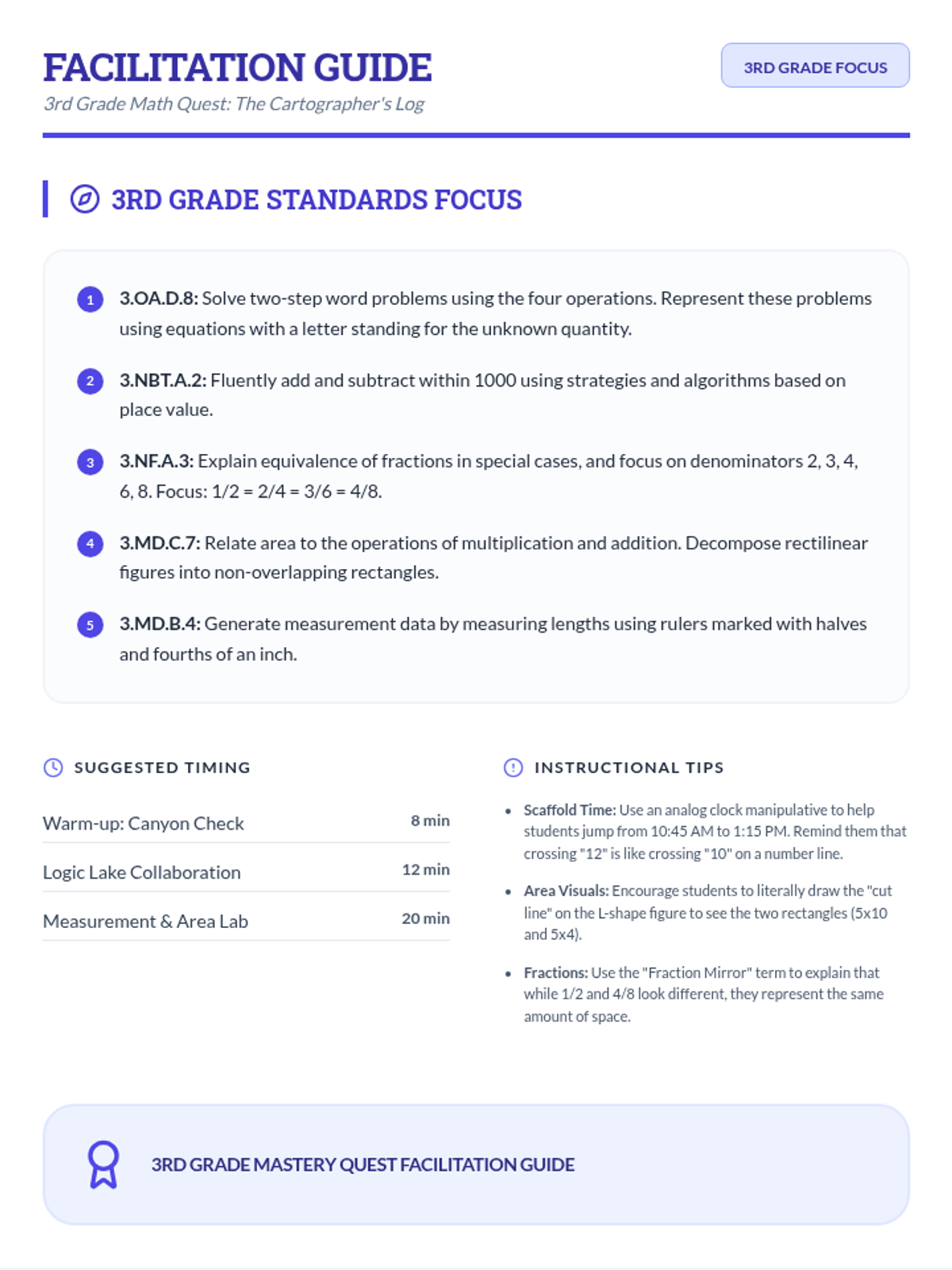 A teacher facilitation guide listing specific learning objectives, suggested pacing, and common student misconceptions for the Math Quest review lesson.