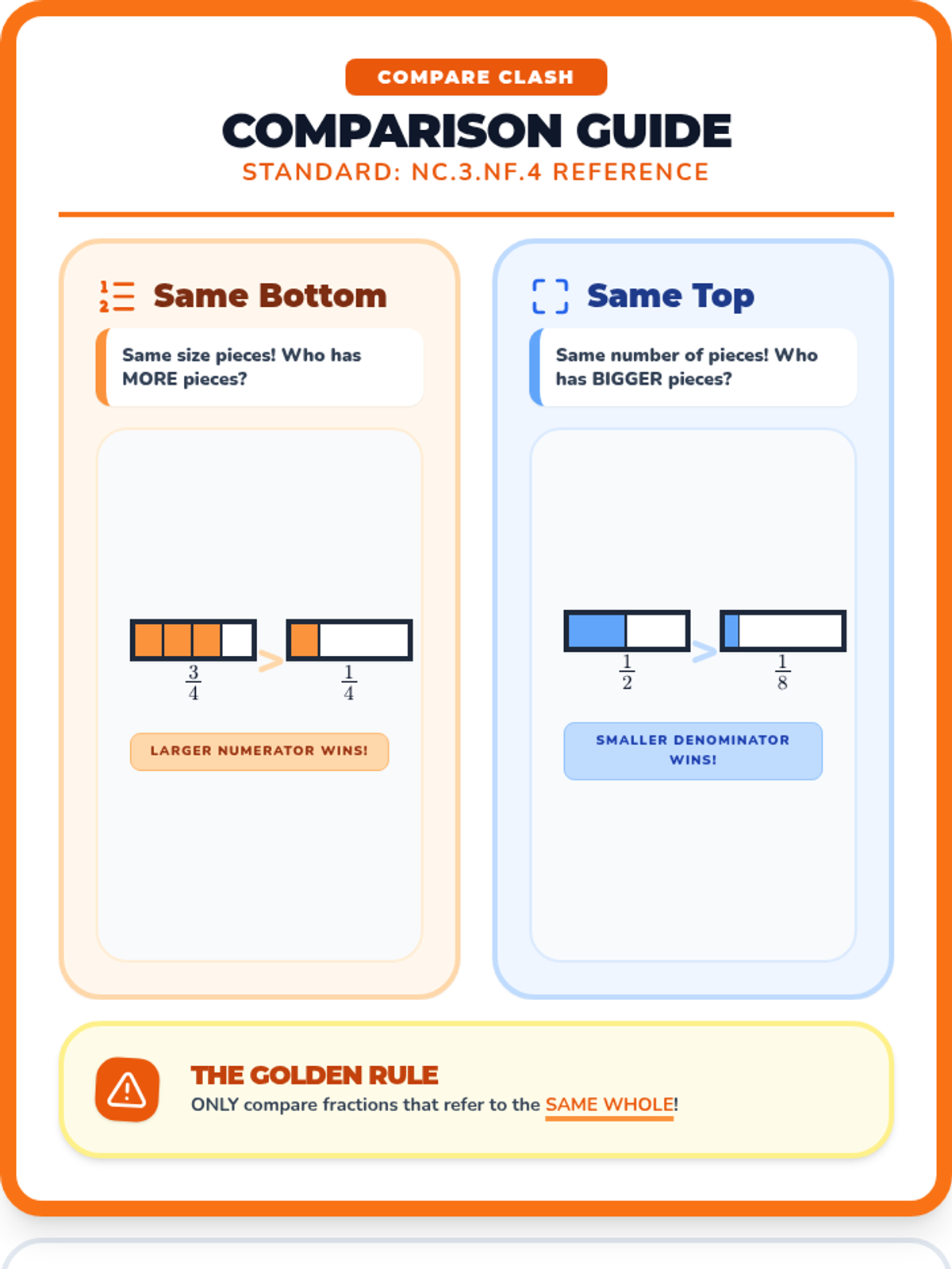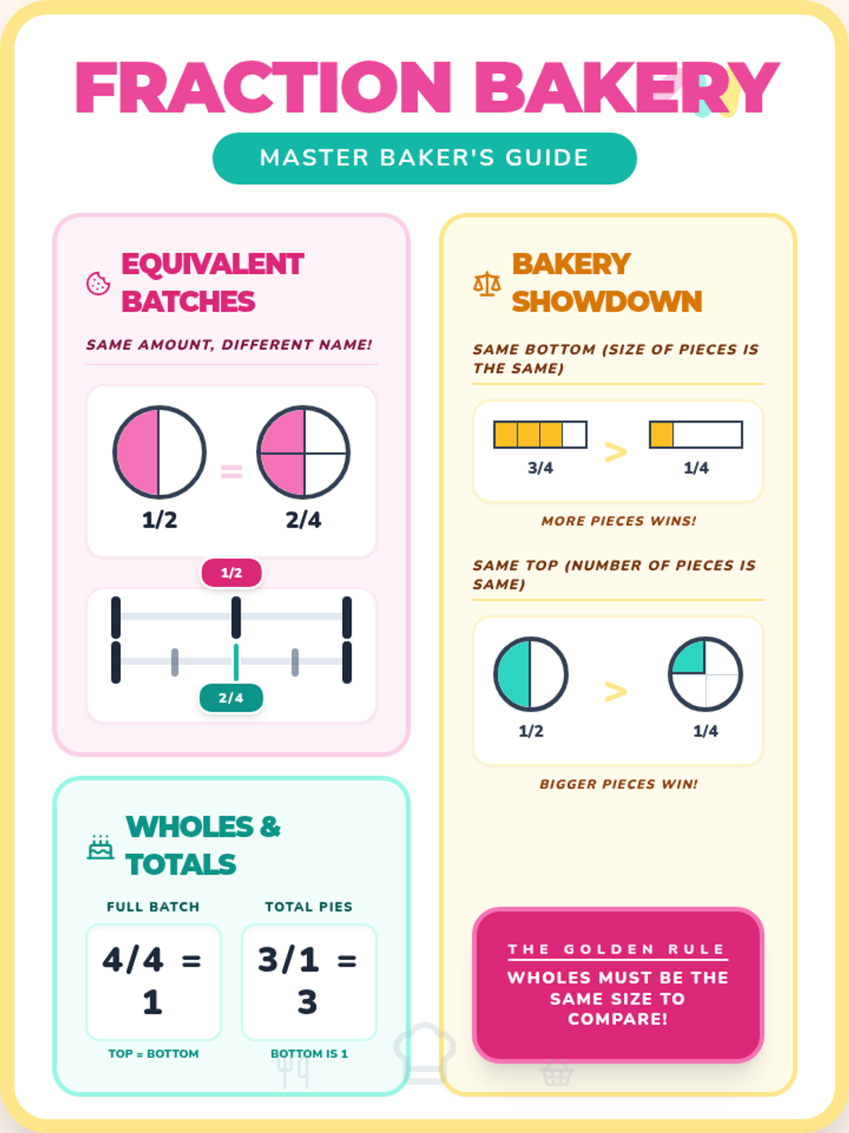 A colorful anchor chart for NC.3.NF.3 and NC.3.NF.4, featuring the 'Fraction Bakery' theme with visual examples of equivalent fractions, wholes, and comparison rules. Optimized for one-page printing.