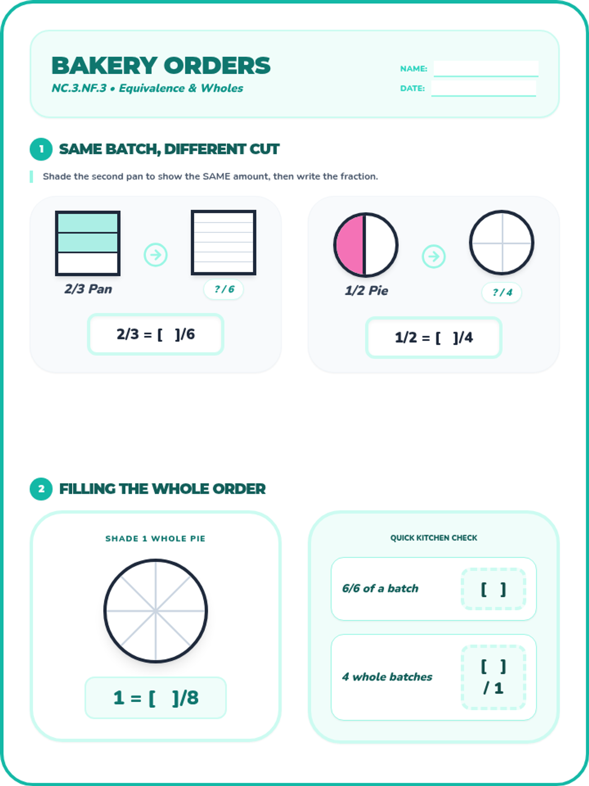 An independent worksheet for NC.3.NF.3, featuring area models and number lines focused on equivalent fractions and whole numbers with a 'Bakery' theme. (2 Pages)