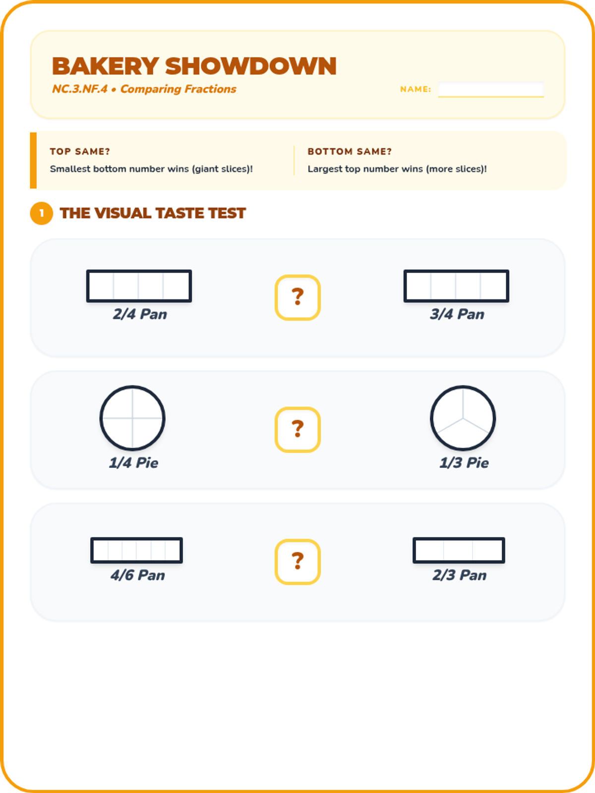 An independent worksheet for NC.3.NF.4, featuring visual comparisons of area models and symbolic comparison exercises with a 'Bakery' theme. (2 Pages)